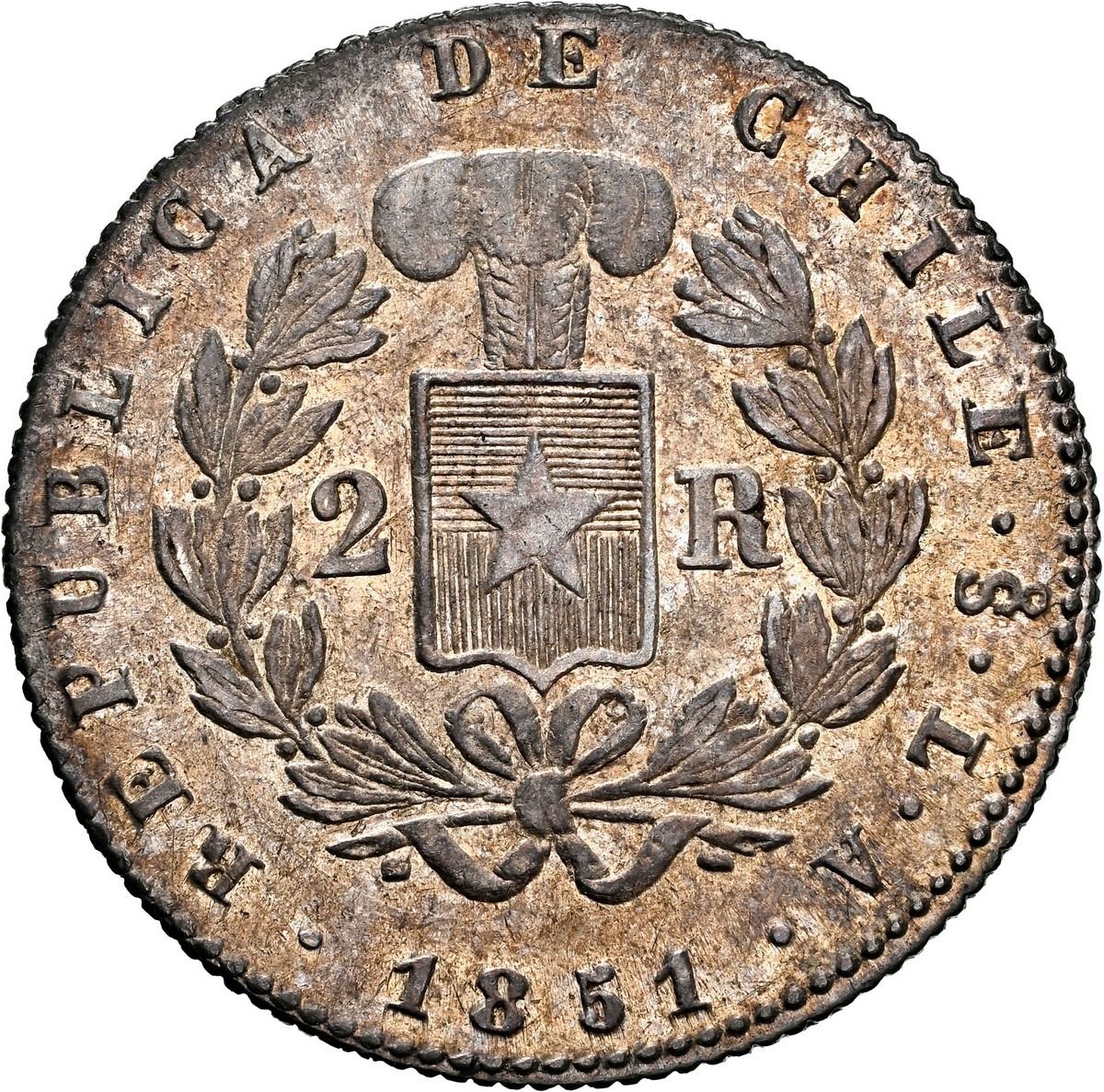CHILE, Santiago, 2 reales, 1851 LA, NGC MS 62 (Colección Val y Mexía Label).