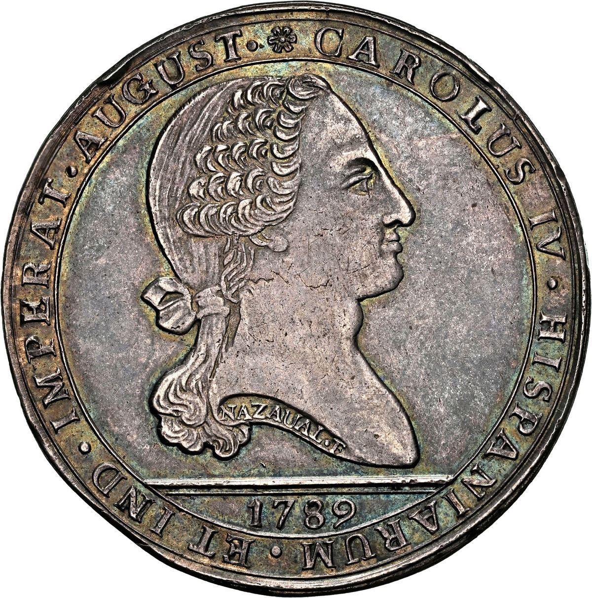 CHILE, Santiago, 8 reales-sized proclamation medal, Charles IV, 1789, for Los Indios Araucanos (Araucanian Indians), by Nazaual, NGC AU 58 (Colección Val y Mexía Label). Fonrobert-9805; Medina-146; Herrera-130. 43 mm. Obverse with fantasy bust of king within legend CAROLUS IV · HISPANIARUM · ET IND · IMPERAT · AUGUST ·, with NAZAUL F in truncation and date in exergue; reverse with two natives tending a field with bird to right above exergue OMNIBUS CLEMENS | NAZAUAL INCIDIT within legend * HIGINIUS PREAFECT · CHIL · PROCLAMIVIT IMPERIUM · ET OBTULIT HOMAG · POPUL · AUST ·. Beautifully rainbow toned with lots of yellow, green, blue and purple colors, choice details with only light high-point wear. Pedigreed to the Val y Mexía Collection.