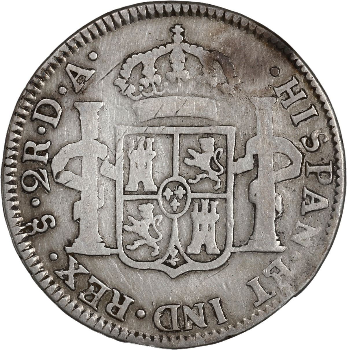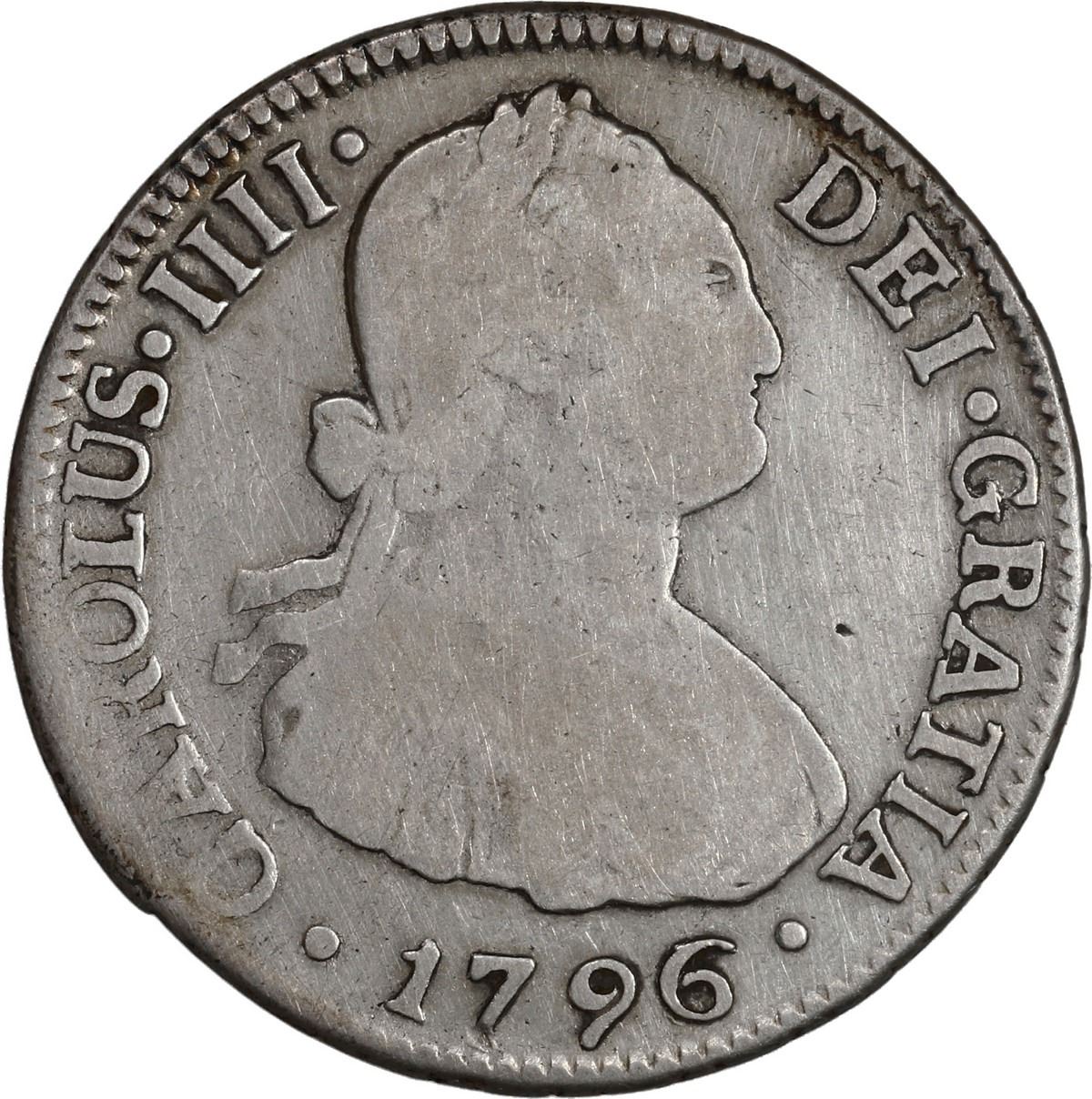 CHILE, Santiago, bust 2 reales, Charles IV, 1796/5 DA. KM-59; Cal-693. 6.53 grams. Fine piece with surface hairlines, some small scratches on the reverse.
