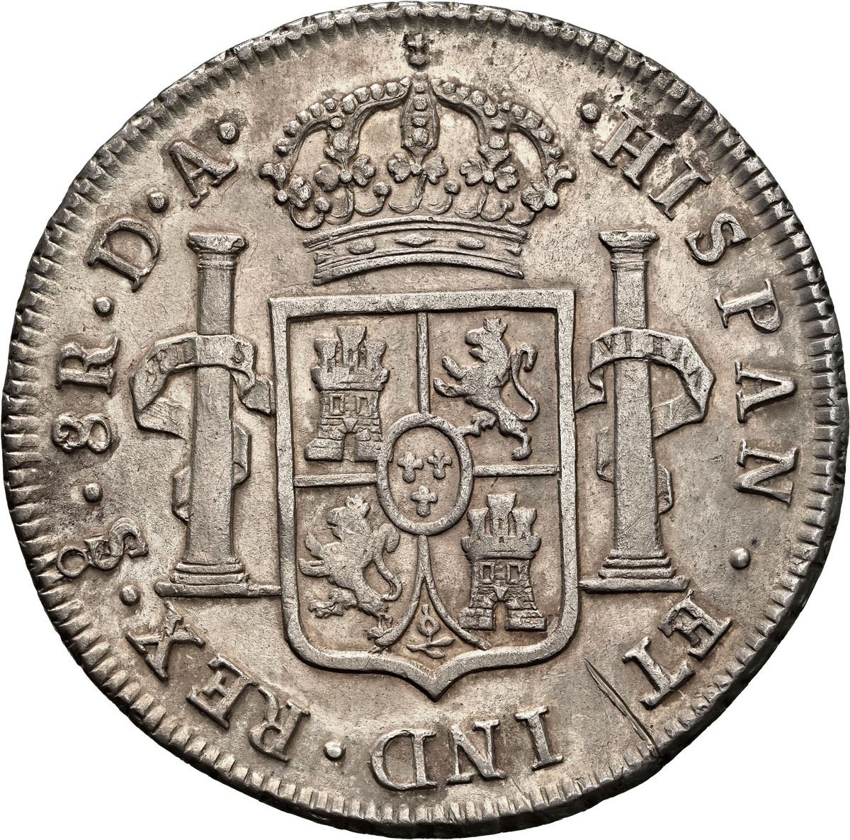 CHILE, Santiago, bust 8 reales, Charles III, 1784 DA, large over small mintmark, very rare, NGC XF details / rev damaged (Colección Val y Mexía Label). Cal-unl (Type 115); KM-unl (31 for type). Broad flan with full rims, light golden toning over muted luster on faintly porous surfaces, heavy scratch below ET on reverse, low mintage of 128,000 coins (most melted), this one technically tied with one other for second finest in the NGC census behind a single AU 50 for the mintmark variety (which is unlisted in references). Pedigreed to the Val y Mexía Collection.