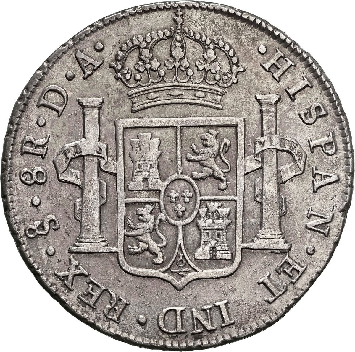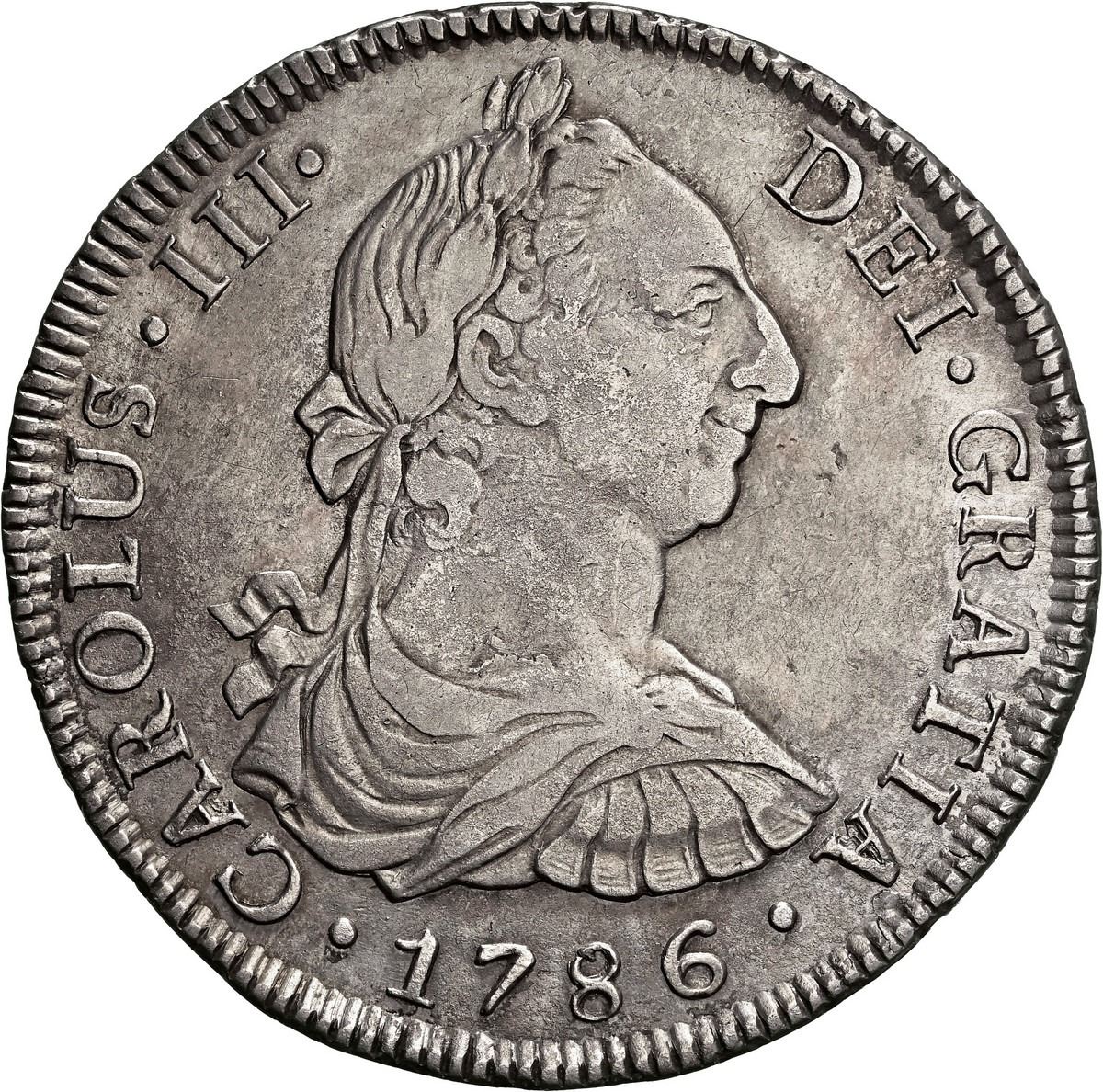CHILE, Santiago, bust 8 reales, Charles III, 1786 DA, very rare, NGC VF 30 (Colección Val y Mexía Label). Cal-1222; KM-31. Broad flan with choice full rims, very light golden toning over muted luster, among 149,000 minted (most melted), second finest in NGC census behind a single XF 45. Pedigreed to the Val y Mexía Collection.