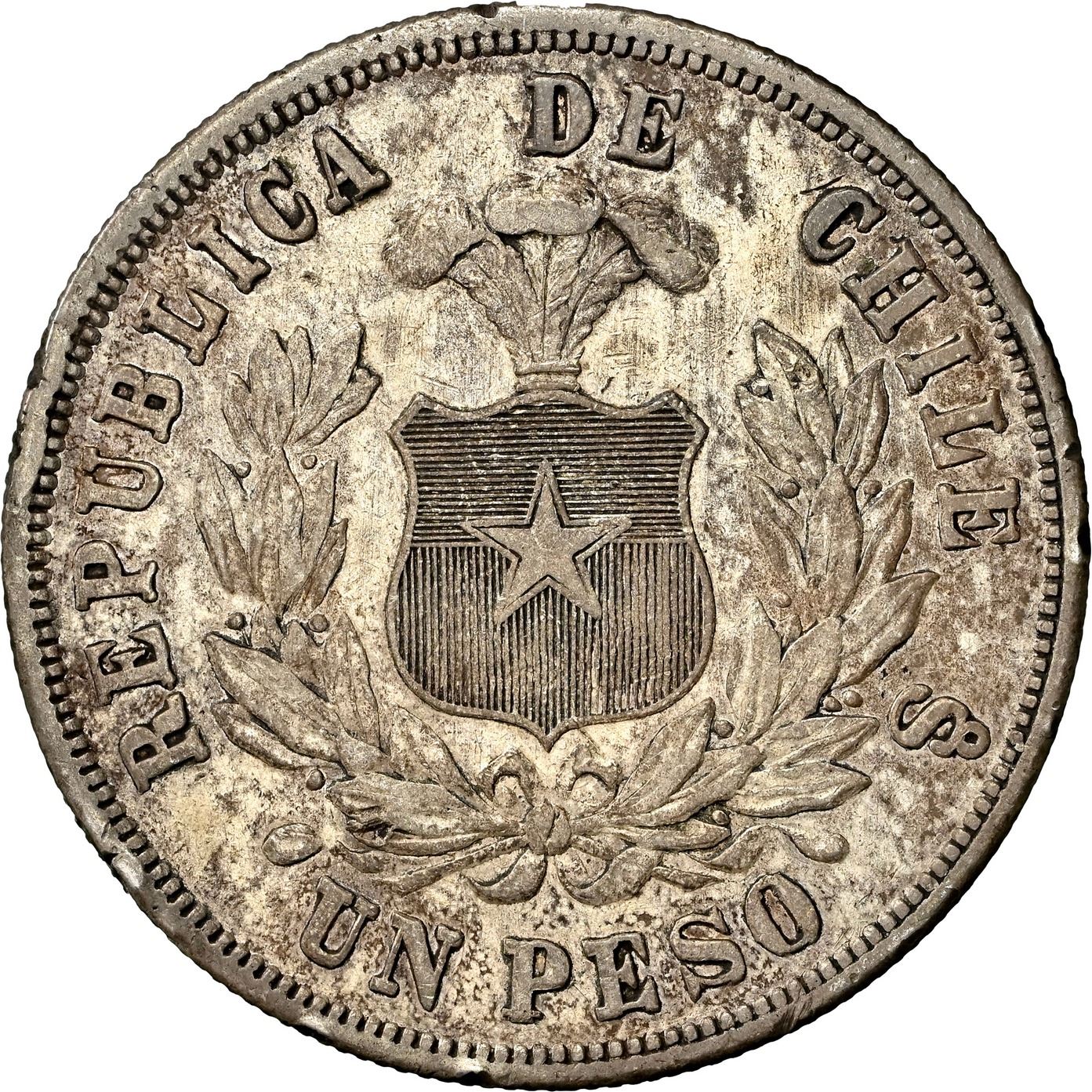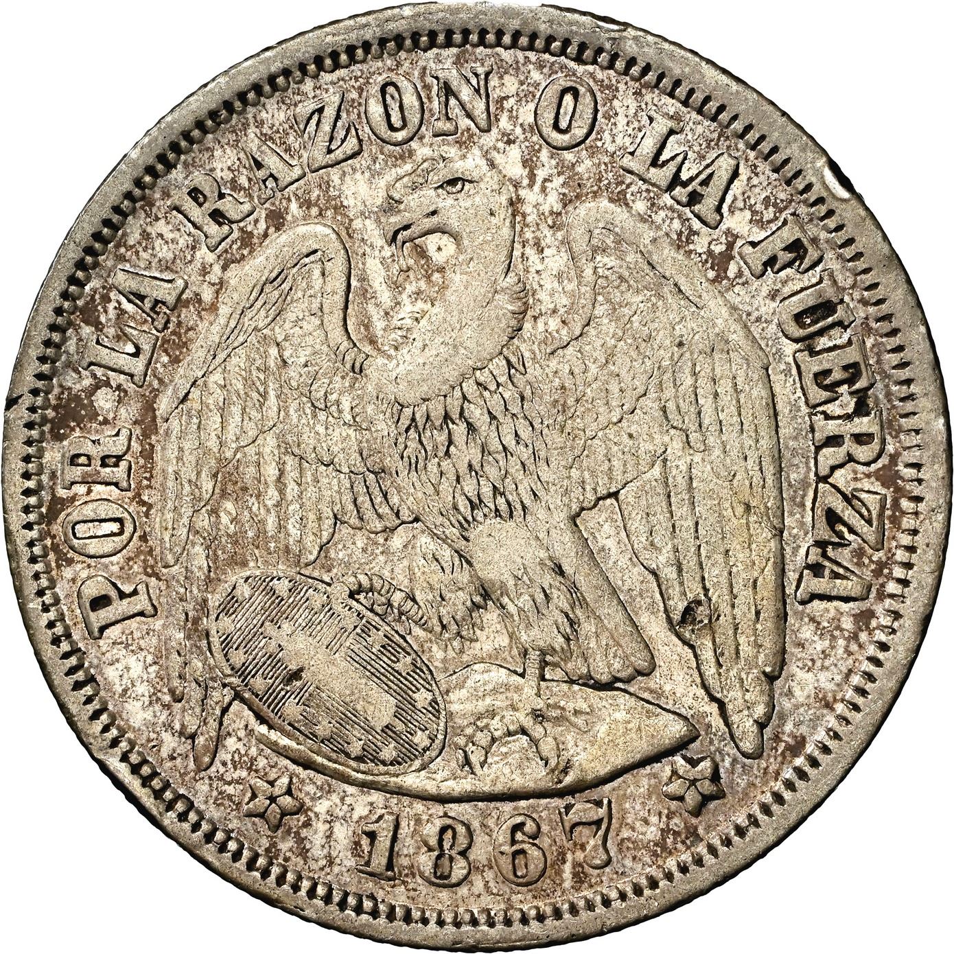 CHILE, Santiago, "condor" peso, 1867, "un peso" variety, NGC XF details / rev cleaned (Colección Val y Mexía Label). KM-142.1. Gray toning with notably darker shield, slightly silvery fields on that side, a few small rim-bumps, desirable first year of the long-running "condor" type. Pedigreed to the Val y Mexía Collection.