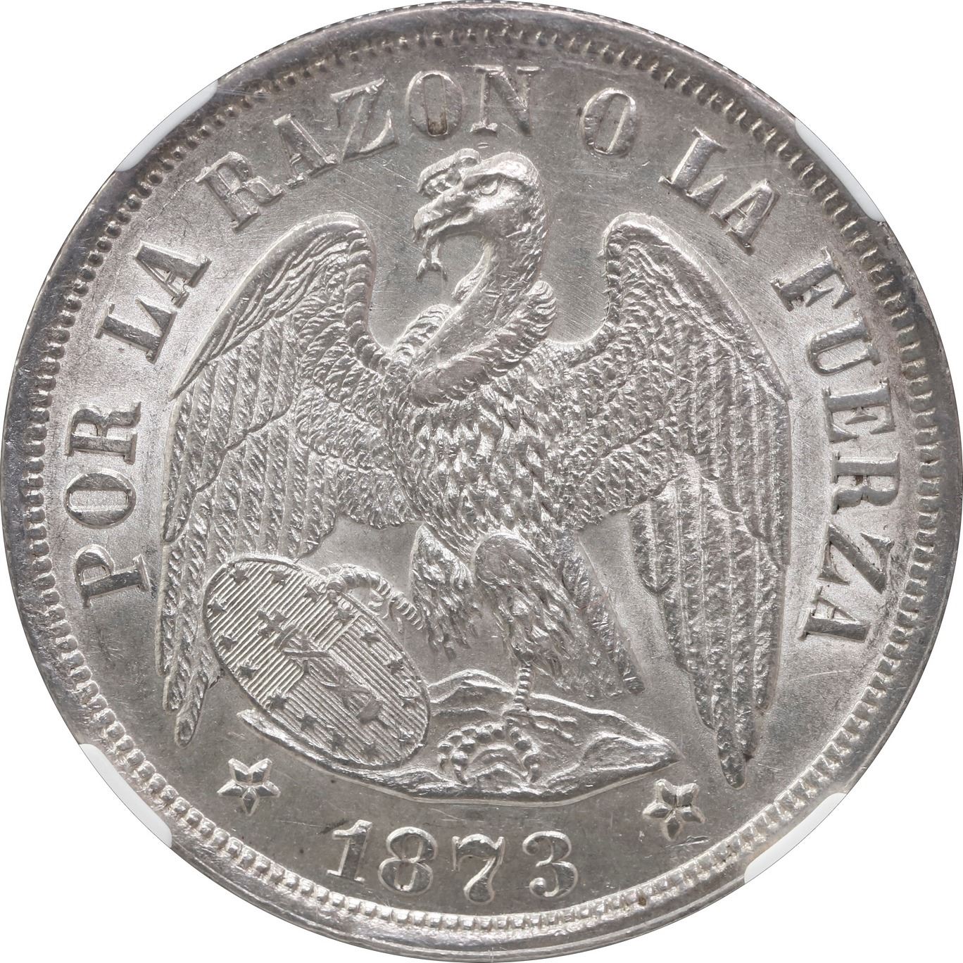 CHILE, Santiago, "condor" peso, 1873, NGC MS 63. KM-142. Cartwheel luster and only the tiniest of bagmarks, currently tied with three others for finest in NGC census behind a single MS 64.