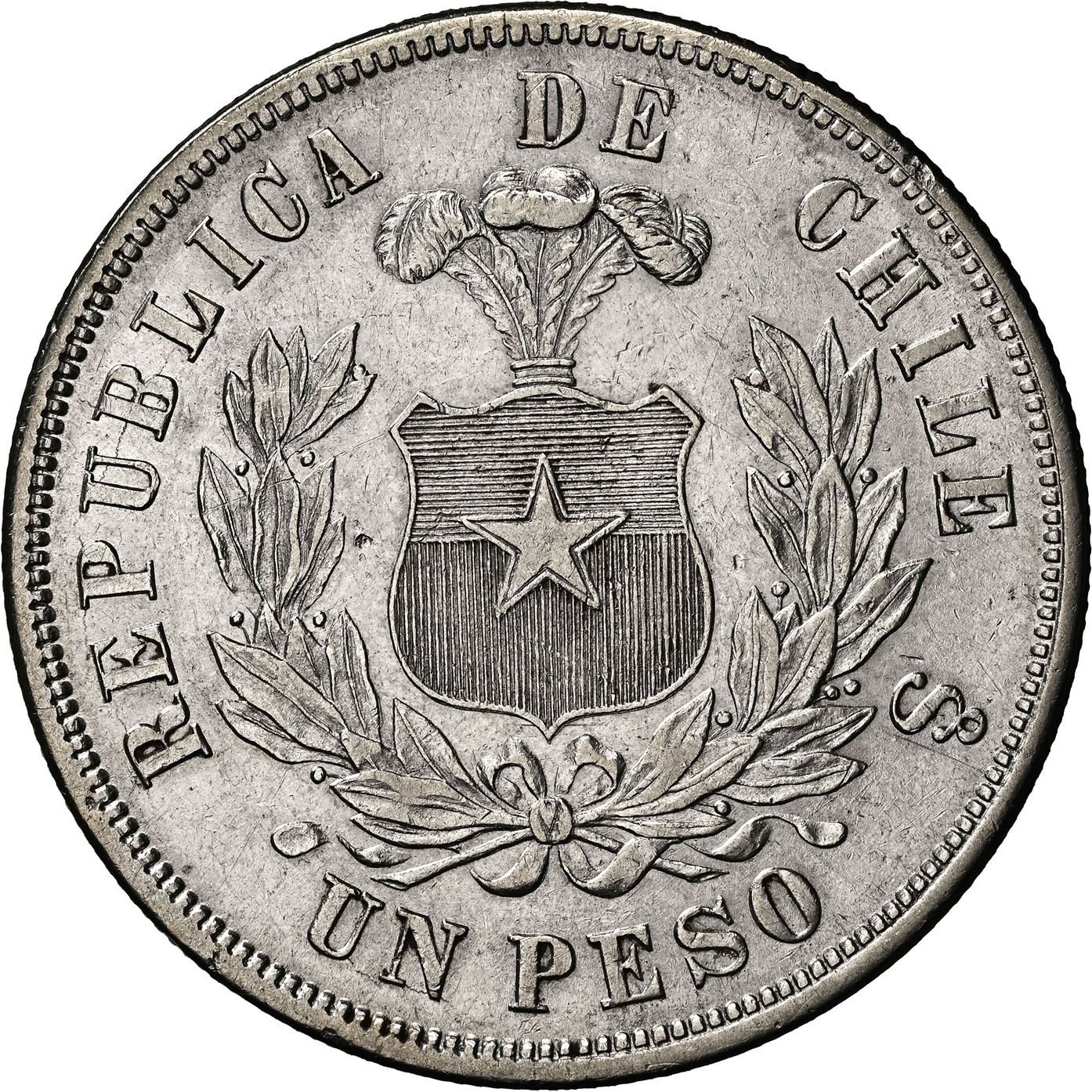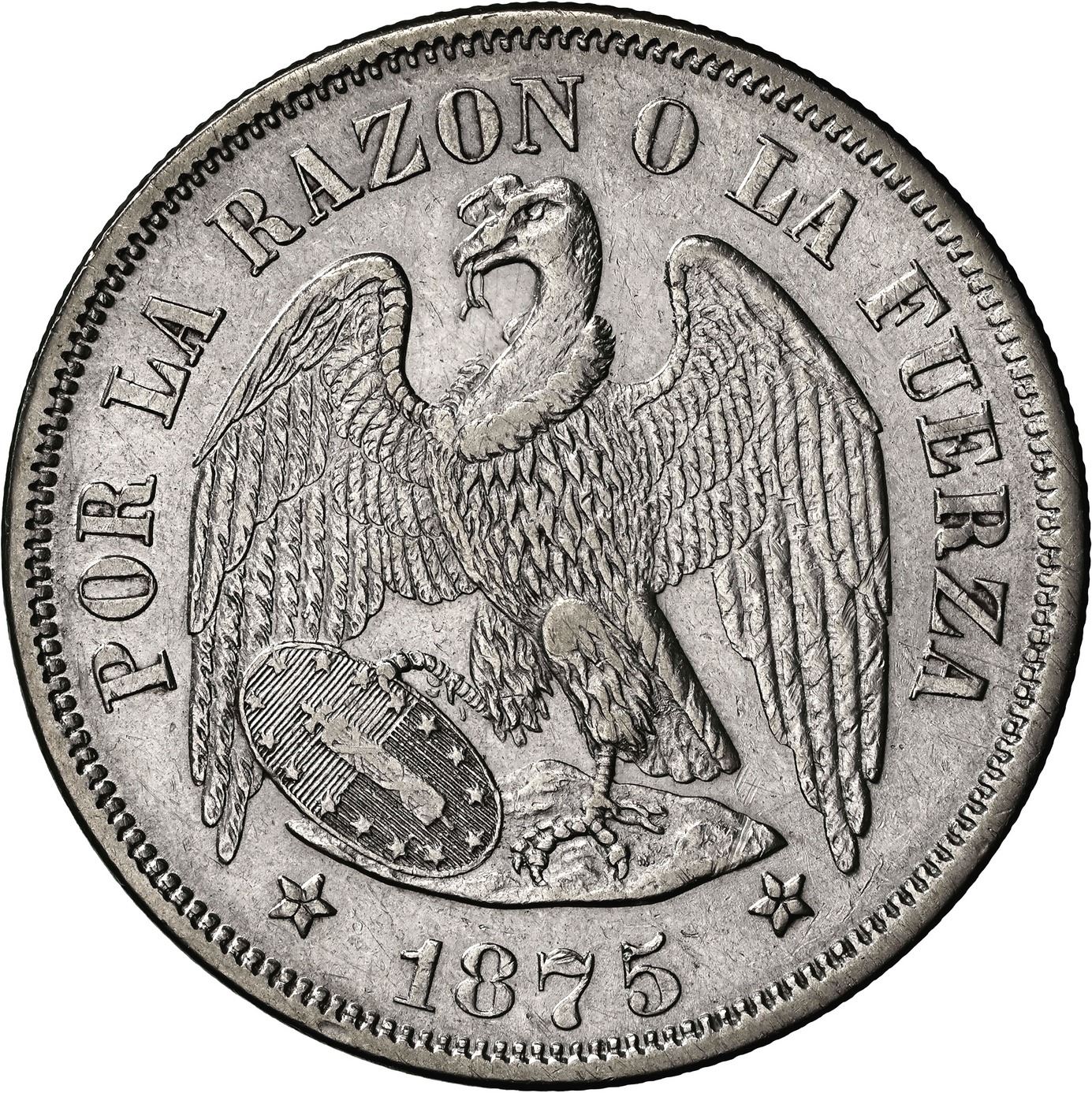 CHILE, Santiago, "condor" peso, 1875, M on ground, NGC AU 55 (Colección Val y Mexía Label). KM-unl (142.1 for type). Typically lustrous and non-toned, with bagmarks but very little actual wear, scarce variety (unlisted in KM and not noted on NGC label) with engraver's raised M on ground to right of condor's foot. Pedigreed to the Val y Mexía Collection.