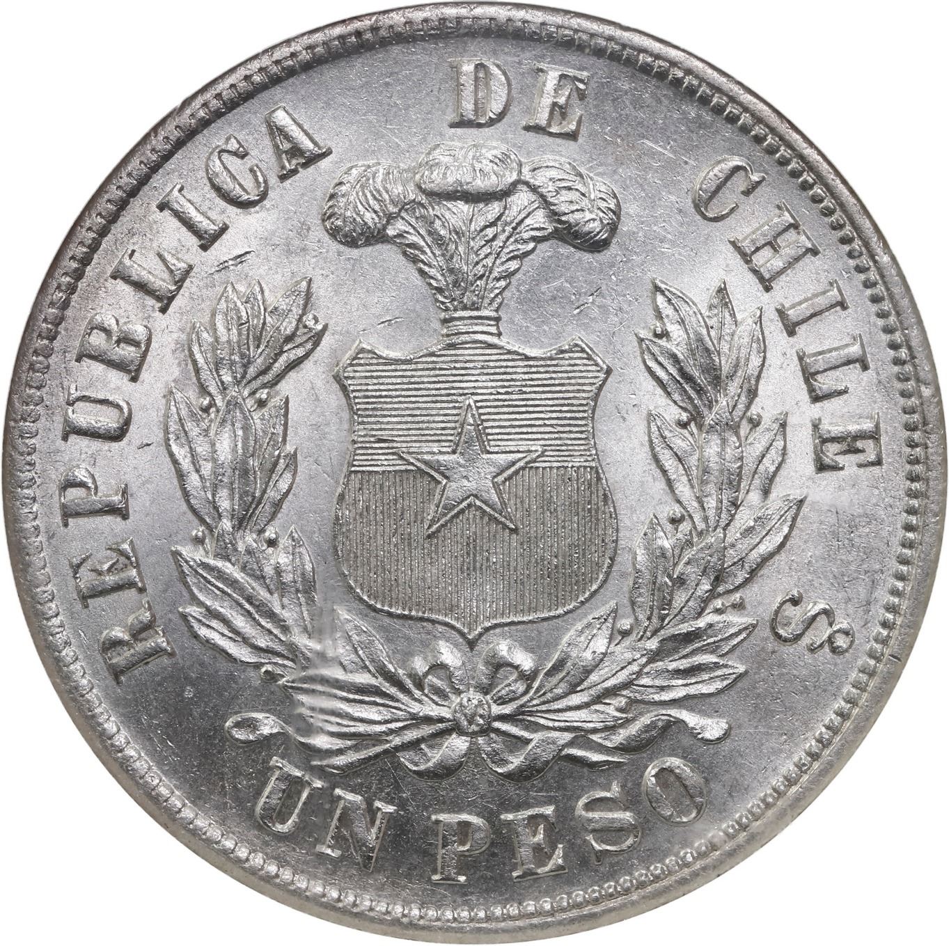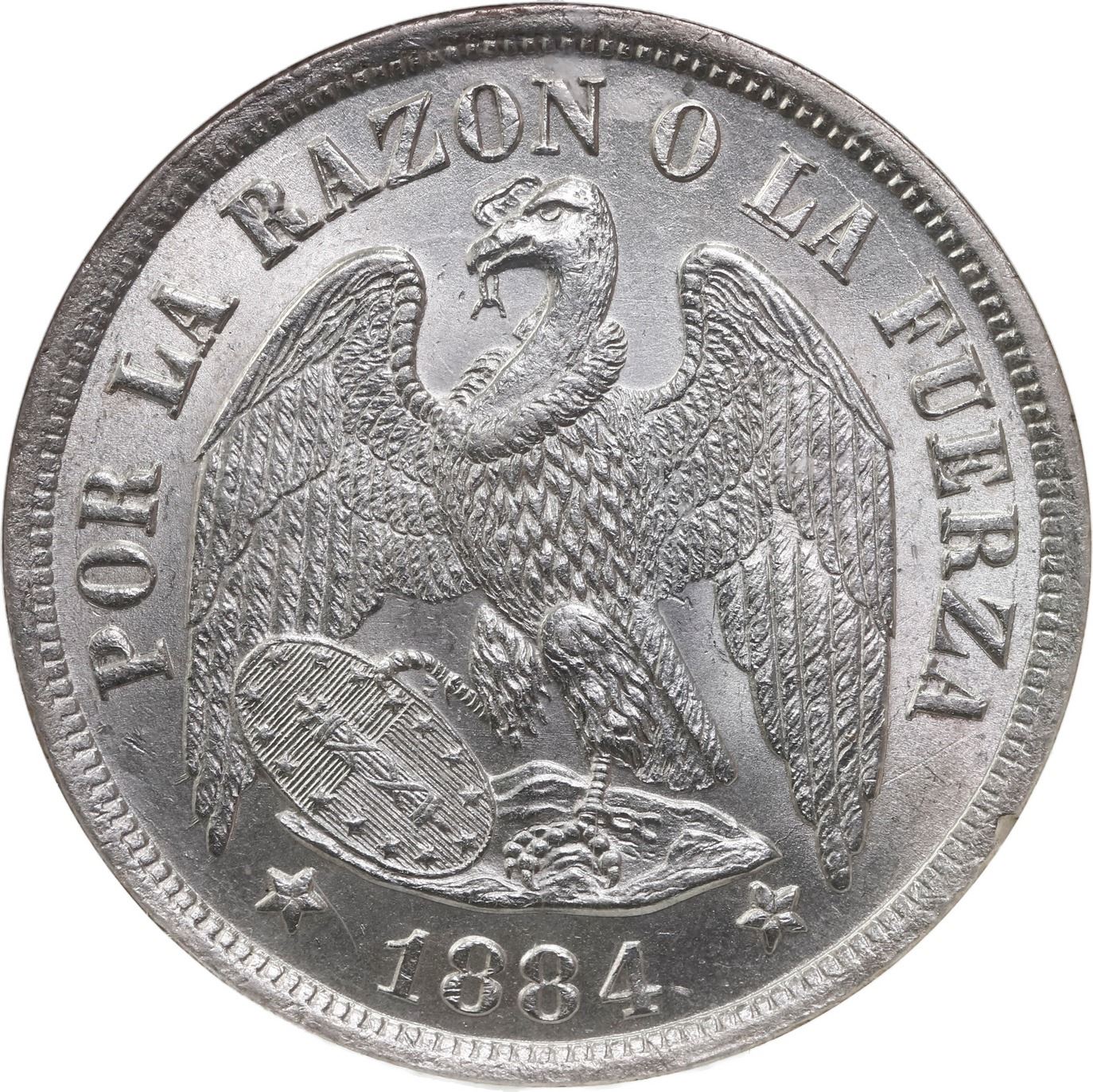 CHILE, Santiago, "condor" peso, 1884, NGC MS 64. KM-142. Frosty white with gem-brilliant luster, tiny bagmarks only.