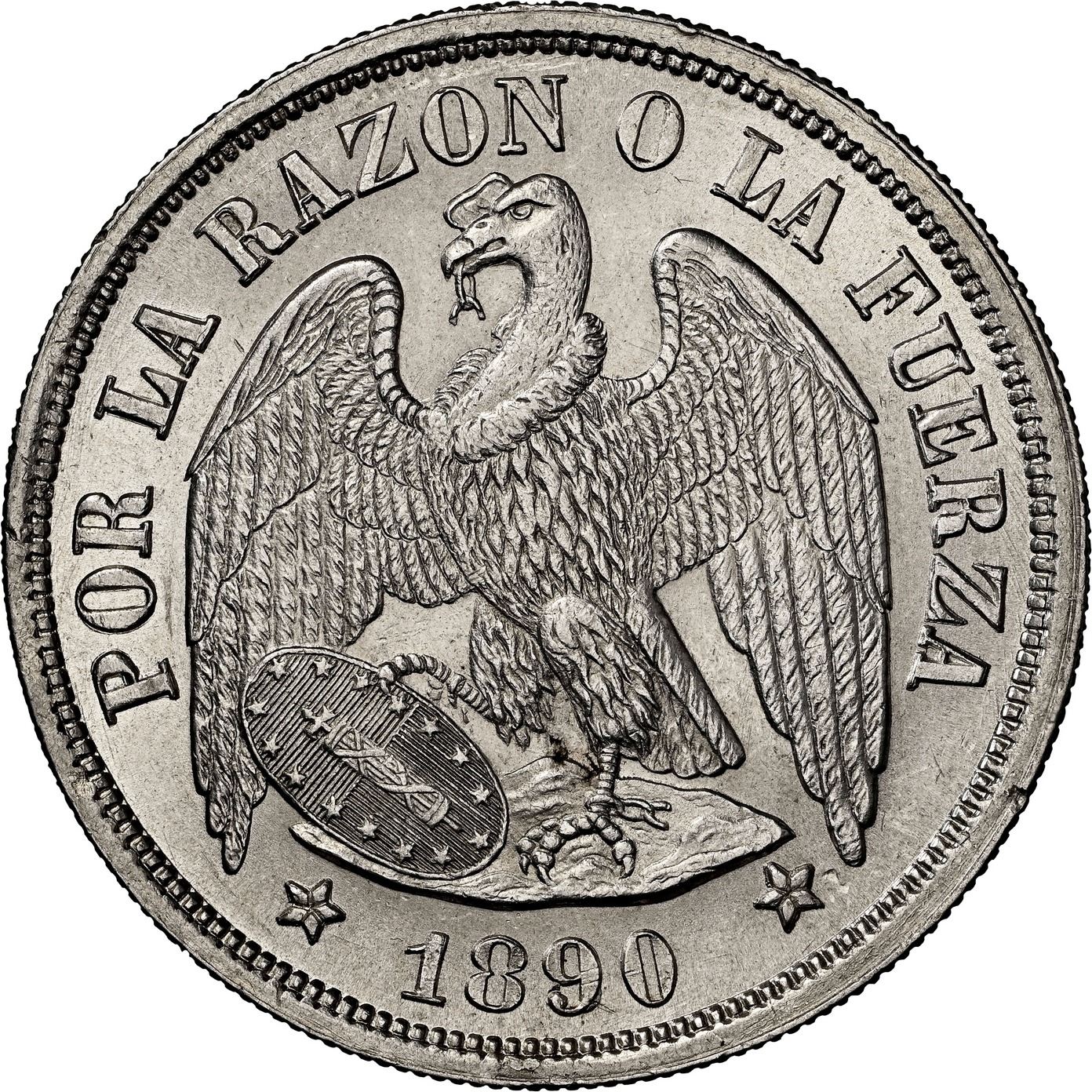 CHILE, Santiago, "condor" peso, 1890/80, NGC MS 64 (Colección Val y Mexía Label). KM-142.1. Frosty and bright with luster, minimal bagmarks, currently tied with one other for second finest in the NGC census. Pedigreed to the Whittier and the Val y Mexía Collections (both stated on label).