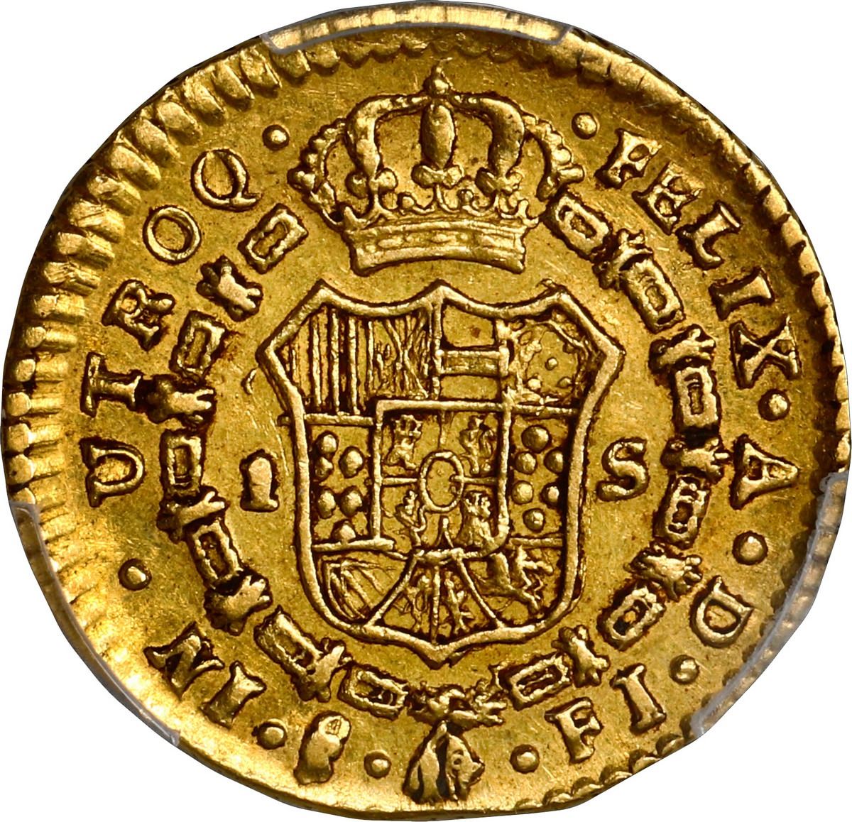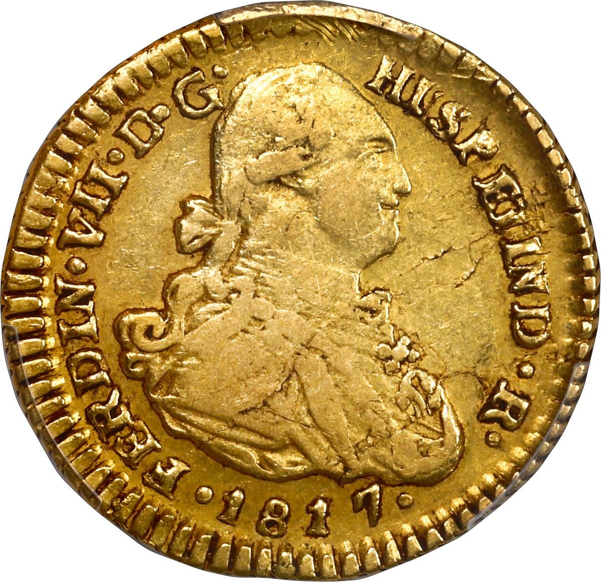 CHILE, Santiago, gold 1 escudo, Ferdinand VII (bust of Charles IV), 1817 FJ, PCGS XF40, finest and only example in PCGS census. Cal-1571; KM-76; Fr-32. Bold strike, nearly full rims, trace of laminations to right of bust, scarce type.