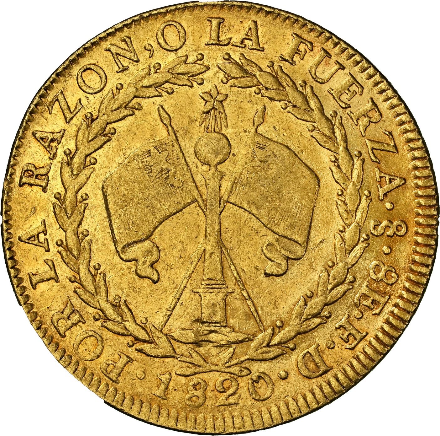 CHILE, Santiago, gold 8 escudos, 1820 FD, NGC AU 53.