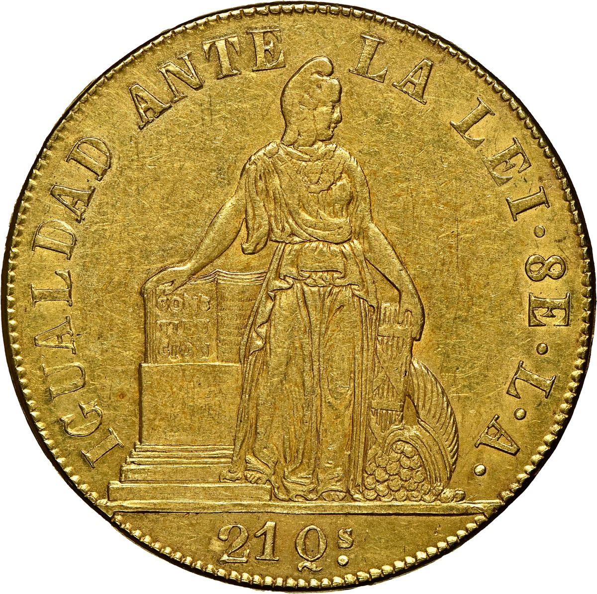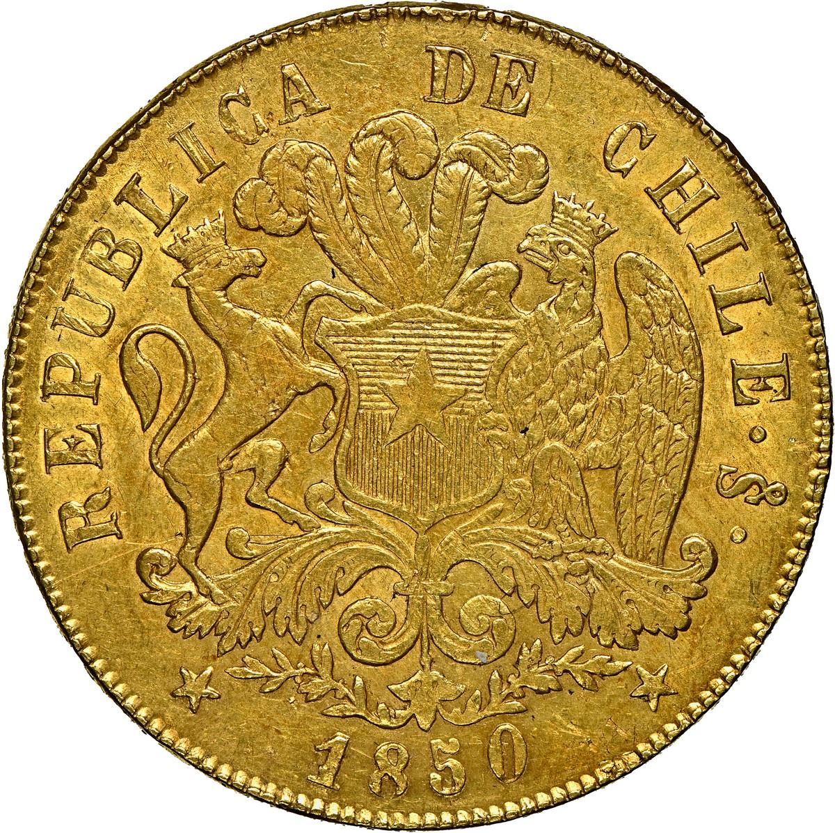 CHILE, Santiago, gold 8 escudos, 1850 LA, MARZO on edge, NGC AU 53. KM-105; Fr-41. Just light, even wear, with muted luster and smooth surfaces.