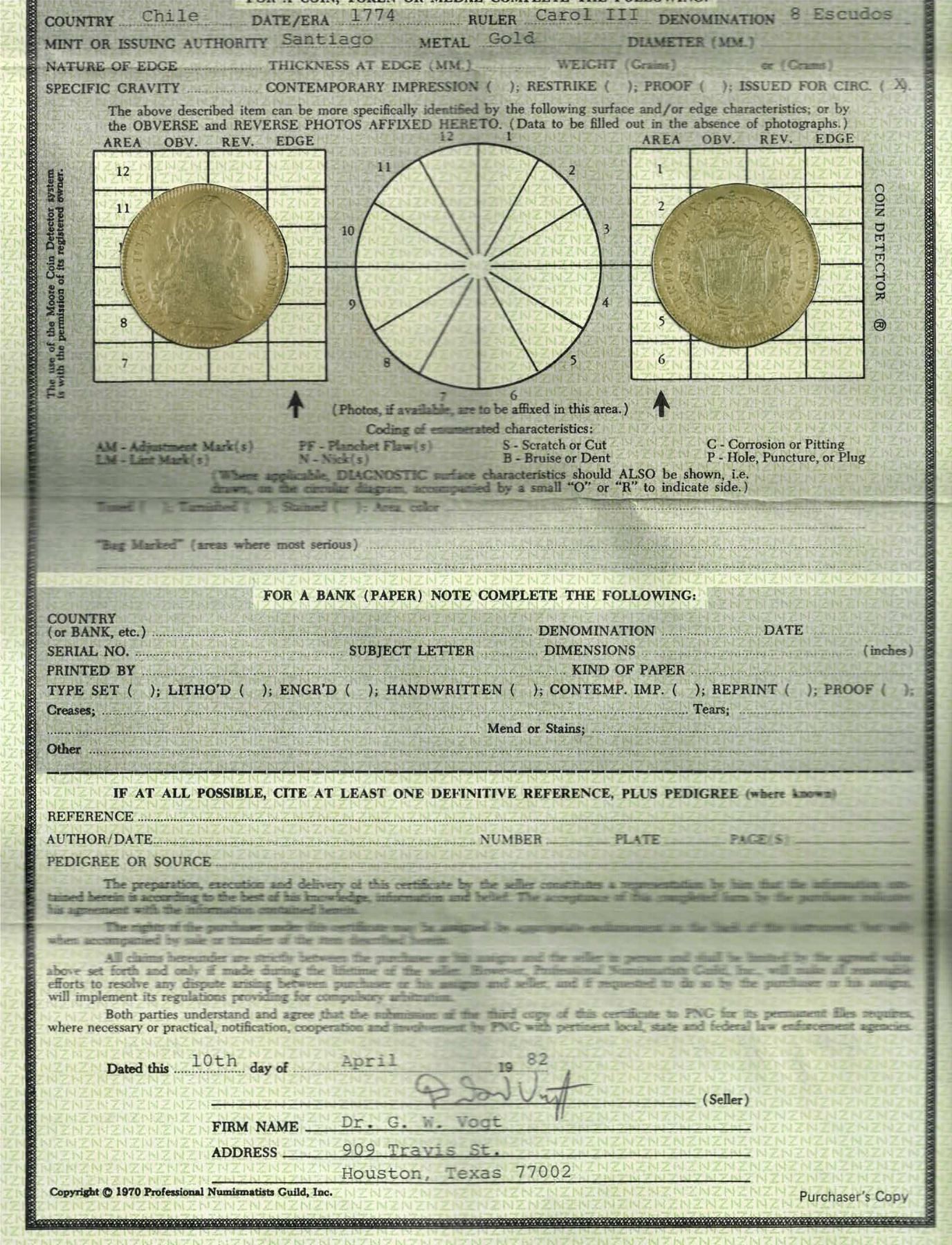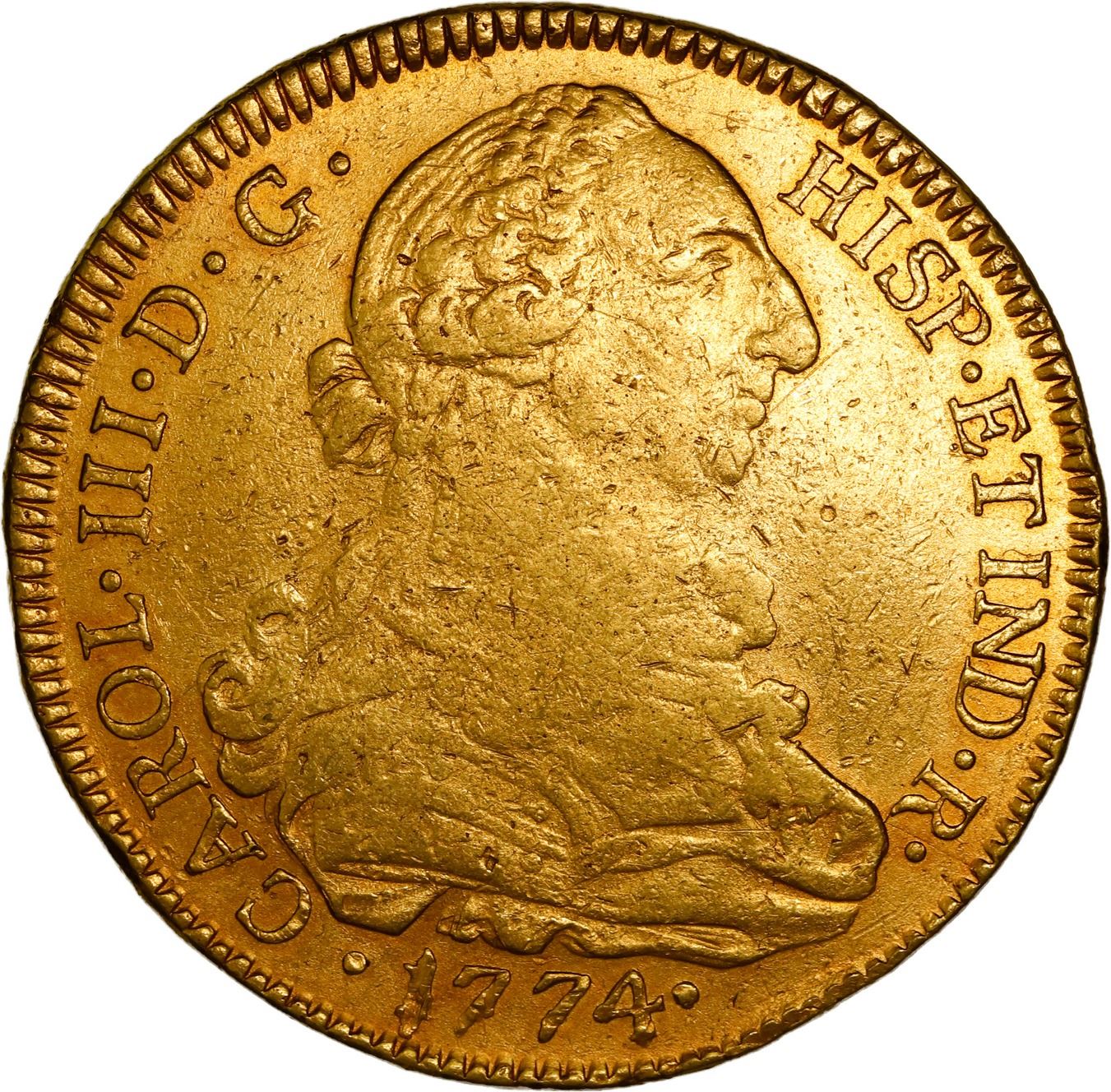 CHILE, Santiago, gold bust 8 escudos, Charles III, 1774 DA. KM-27; Fr-15; Cal-2148. 26.76 grams. VF with much surface chatter, a few scratches on the reverse, rich golden toning around the legends. With PNG photo-certificate dated April 10, 1982.