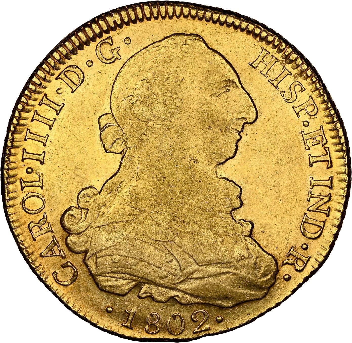 CHILE, Santiago, gold bust 8 escudos, Charles IV, 1802 JJ, NGC AU 53 (Colección Val y Mexía Label).