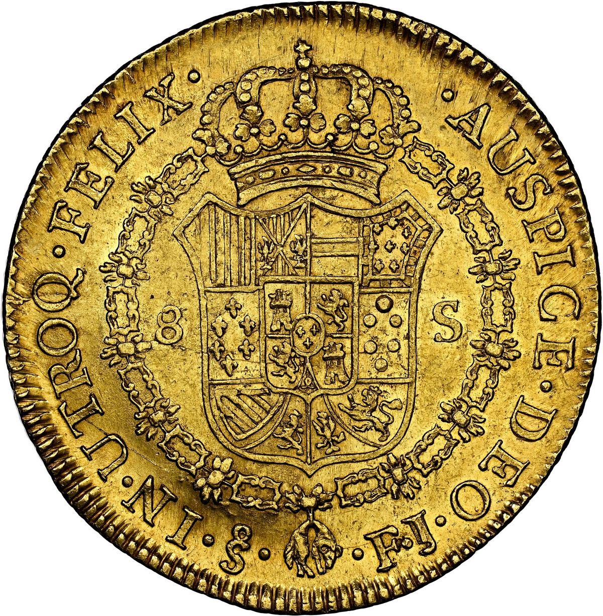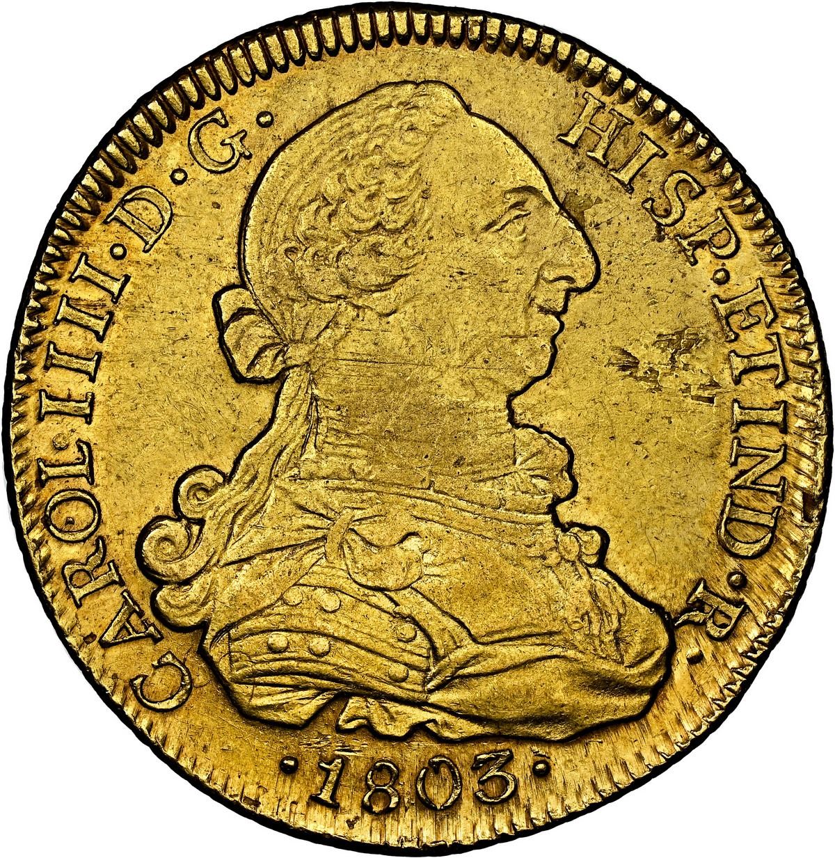 CHILE, Santiago, gold bust 8 escudos, Charles IV (bust of Charles III), 1803 FJ/JJ, rare, NGC AU 55.