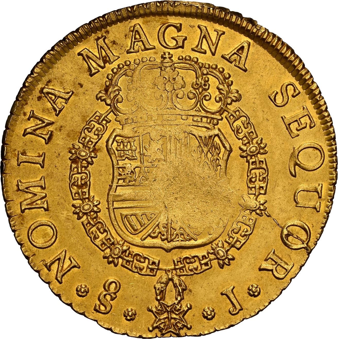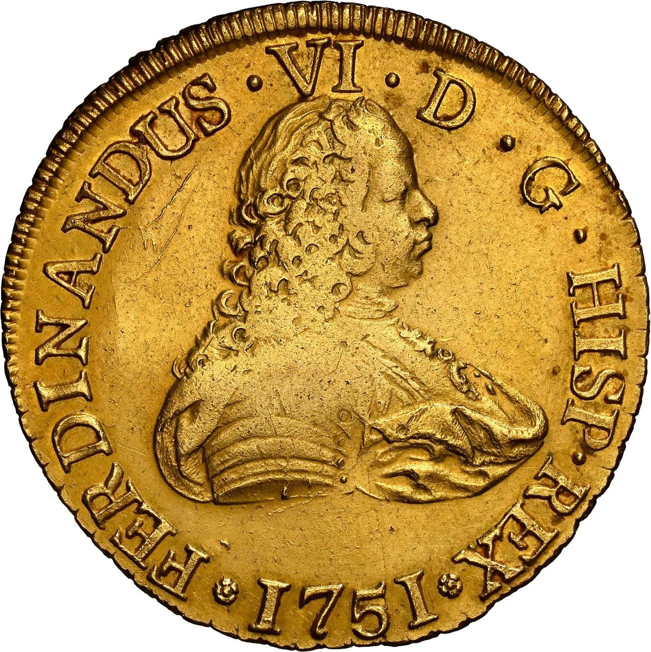CHILE, Santiago, gold bust 8 escudos, Ferdinand VI, 1751 J, NGC AU details / cleaned (La Luz). Cal-824; KM-3; Fr-3. Weak centers with die-cracks and bulges, matte surfaces with hairlines, slightly off-center strike. Recovered from: Luz, sunk in 1752 off Montevideo, Uruguay