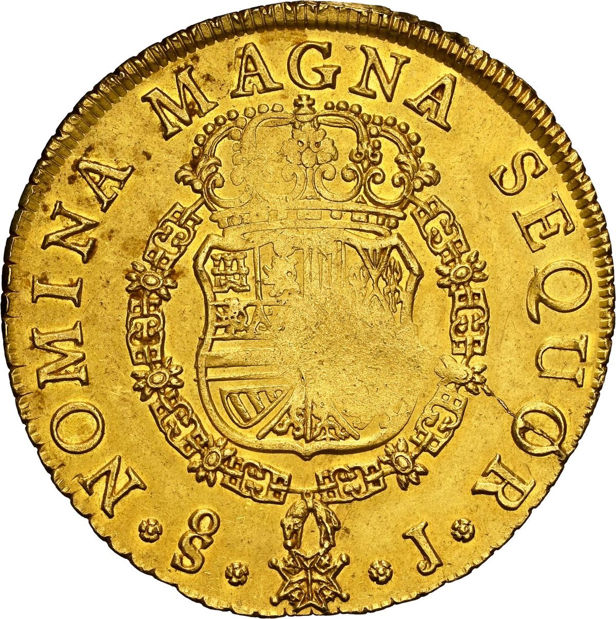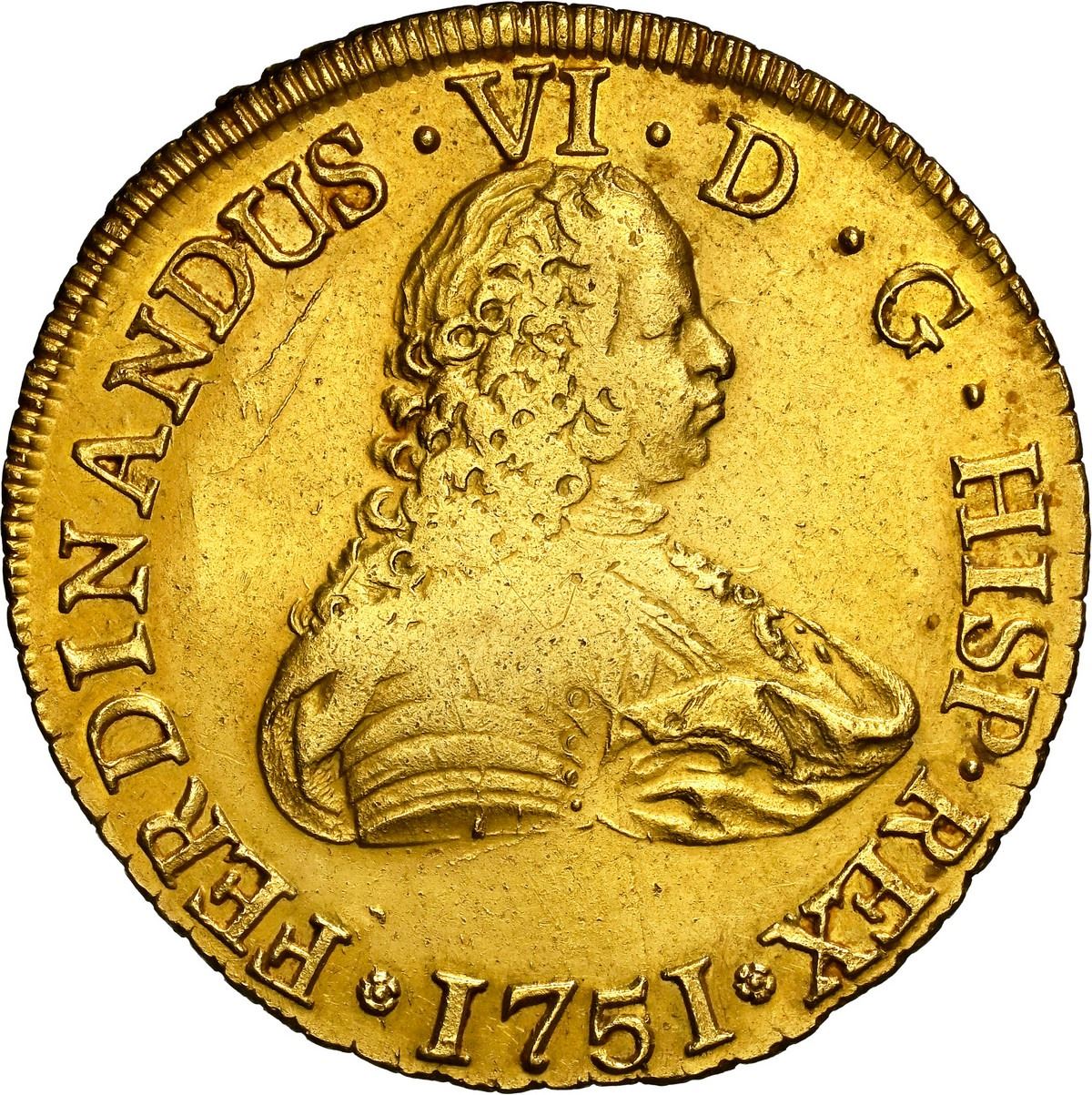 CHILE, Santiago, gold bust 8 escudos, Ferdinand VI, 1751 J, NGC AU details / cleaned / La Luz. Cal-824; KM-3; Fr-5. Typically weak centers with die-cracks and bulge from die-buckling, matte surfaces with hairlines, slightly off-center strike. Recovered from: Luz, sunk in 1752 off Montevideo, Uruguay