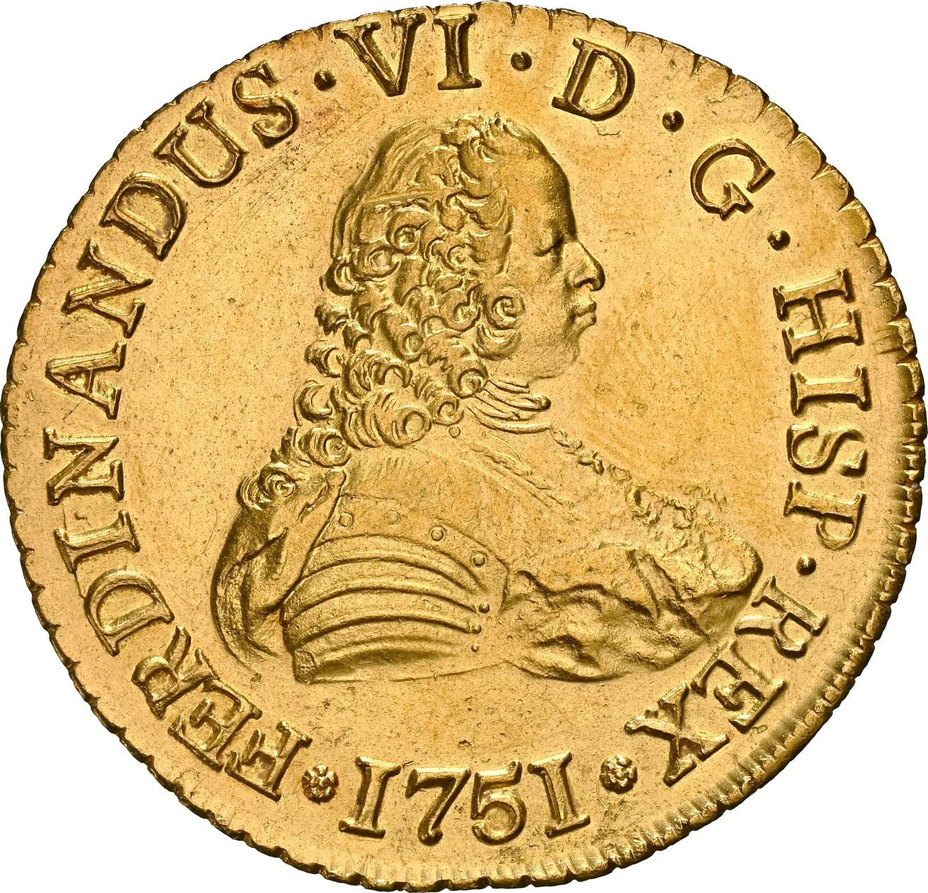 CHILE, Santiago, gold bust 8 escudos, Ferdinand VI, 1751 J, NGC UNC details / cleaned (Shipwreck Blue Label), ex-Luz. Cal-824; KM-3; Fr-5. Exceptional strike for the issue, with no central weakness or flaws, somewhat lustrous, choice overall, also no hairlines despite the limiter on the label. From the Luz (1752). Recovered from: Luz, sunk in 1752 off Montevideo, Uruguay