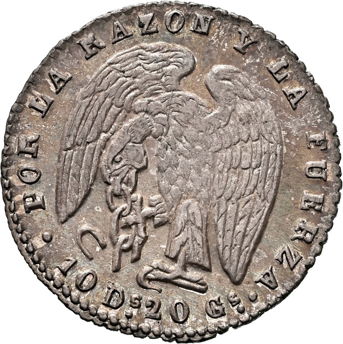 CHILE, Santiago, ½ real, 1844 IJ, NGC MS 65 (Colección Val y Mexía Label). KM-98.2. Richly rainbow toned with underlying luster, die variety with the Y in legend shaped more like a V, rare gem grade. Pedigreed to the Val y Mexía Collection.