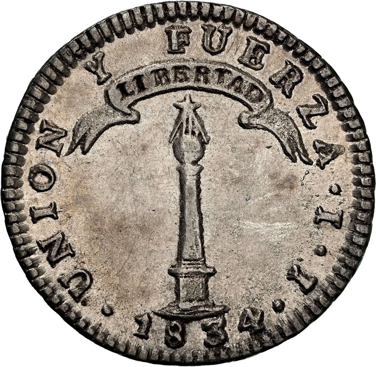 CHILE, Santiago, "volcano" 1 real, 1834 IJ, NGC AU 58 (Colección Val y Mexía Label). KM-91. Brightly lustrous and well struck with full rims, scarce issue (16,000 minted) in rare grade. Pedigreed to the Val y Mexía Collection.