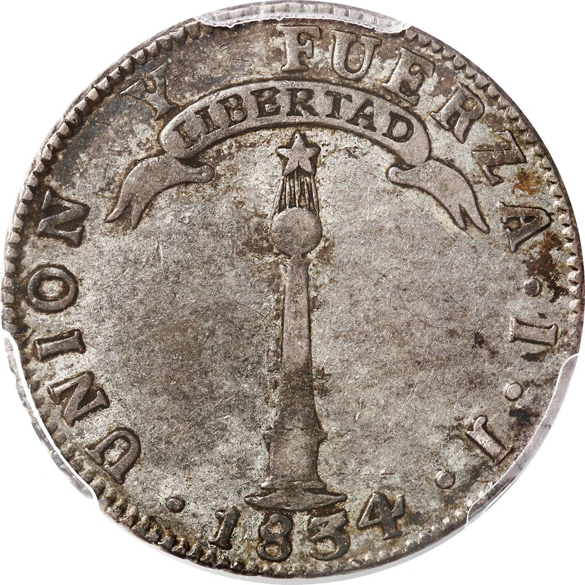 CHILE, Santiago, "volcano" 2 reales, 1834 IJ, PCGS XF40, ex-Val y Mexía.