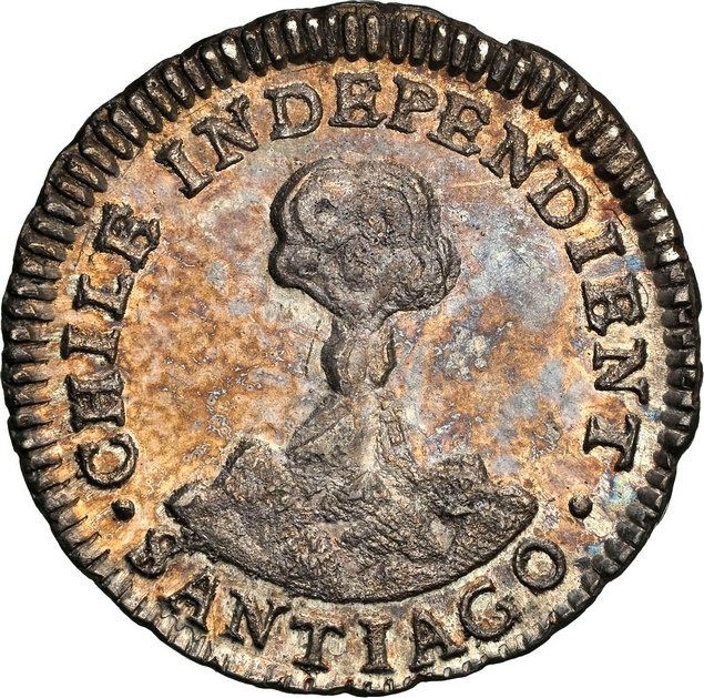 CHILE, Santiago, "volcano" ½ real, 1834/3 I, NGC MS 62 (Colección Val y Mexía Label), finest and only example in NGC census. KM-90. Beautifully rainbow toned over luster, choice strike with rims almost full, a couple small marks only, apparently quite scarce as we cannot find any others auctioned in recent years. Pedigreed to the Val y Mexia Collection.