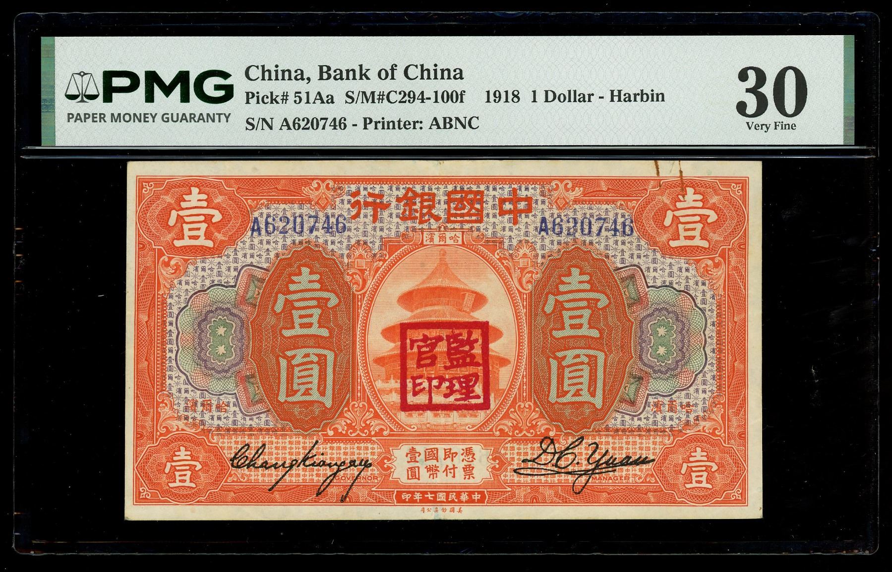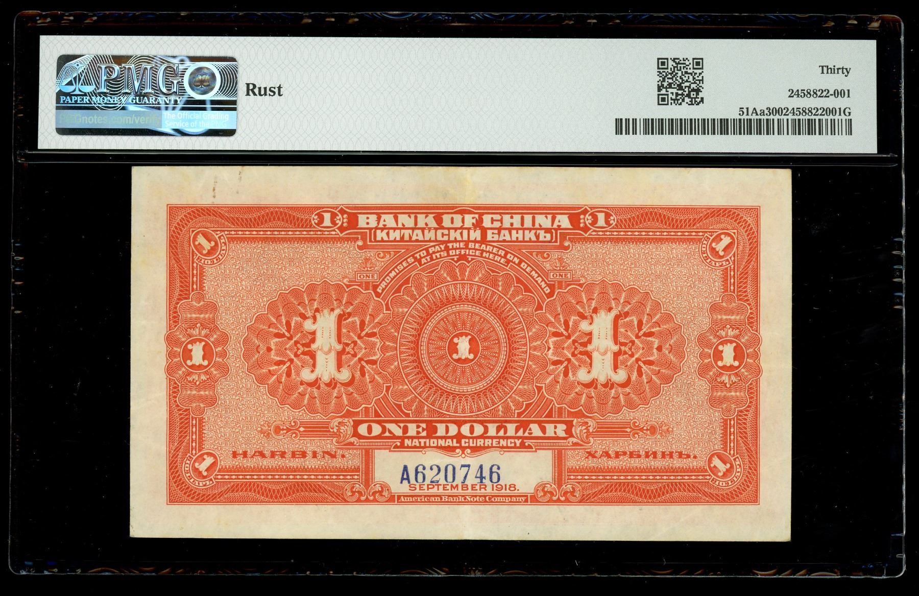 CHINA, Harbin, Bank of China, 1 dollar, September 1918, serial A620746, very rare, PMG VF 30. Pick-51Aa; S/M-C294-100f. Very rare note issued in 1918 for the Bank of China in Harbin with bank title on back in both English and Russian, central vignette of the Temple of Heaven at center, bold red design with four character overprint in red at center, spot of paper clip rust at upper right corner, second finest known in the PMG census behind a VF 35 EPQ note that sold for $3,800 hammer in a 2024 Stack's Bowers Hong Kong sale.