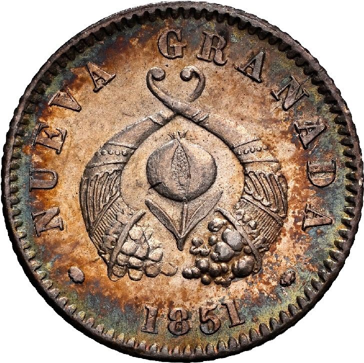 COLOMBIA, Bogotá, 1/2 real, 1851, NGC MS 64. Restrepo-179.2; KM-110. Choice bold strike with lovely ring of deep rainbow toning at rims, cartwheel luster within, a beautiful example in rare gem grade. Pedigreed to the Gregorio Toulemonde Collection (stated on label).