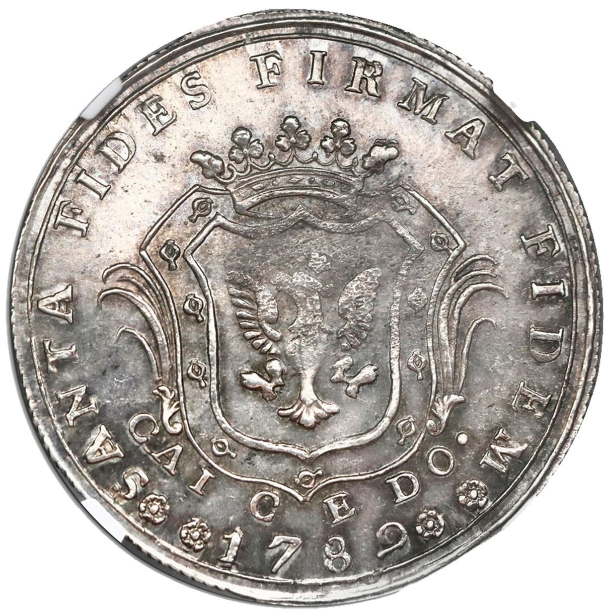 COLOMBIA, Bogotá, 4 reales-sized proclamation medal, Charles IV (bust of Charles III), 1789, corded edge, NGC AU 58, finest and only example in NGC census, ex-Santander. Restrepo-p. 121; Herrera-215; Medina-253. 33 mm. Obverse with armored bust of Charles III [sic] within legend CAROL.IV.D.G. HISP.ET IND.R. with Maltese cross at bottom; reverse with city arms (spread-eagle in crowned shield within wreath) above CAI CEDO., all within legend SANTA FIDES FIRMAT FIDEM with date 1789 between pairs of rosettes at bottom. Lightly toned over luster, tiny spots of extra metal behind head and minor graininess above center on reverse. While several examples have been on the market in recent years, this remains the finest example. Pedigreed to the Santander Collection (Sedwick Auction 26, lot 1139).