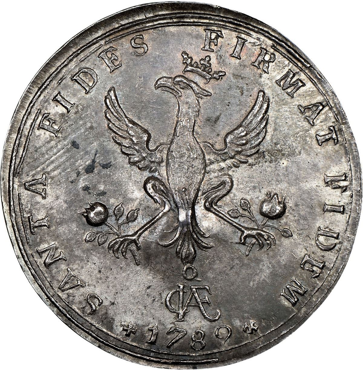 COLOMBIA, Bogotá, 4 reales-sized proclamation medal, Charles IV (bust of Charles III), 1789, rare, NGC MS 61, finest and only example in NGC census, ex-Santander. Restrepo-p. 121; Herrera-unl; Medina-254. 18.68 grams. 35 mm. Obverse with armored bust of Charles III [sic] within legend CAROL.IV.D.G. HISP.ET IND.R. with Maltese cross at bottom; reverse with crowned eagle facing left with wings spread above monogram (CIAEo?) within legend SANTA FIDES FIRMAT FIDEM with date 1789 between Maltese crosses at bottom. Deeply toned over muted luster, oversized flan, no other examples located in recent sales. Thematically the reverse is the same design as the Charles III proclamations offered here in prior lots. Pedigreed to the Santander Collection (Sedwick Auction 26, lot 1138).