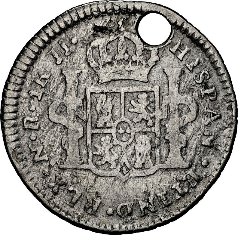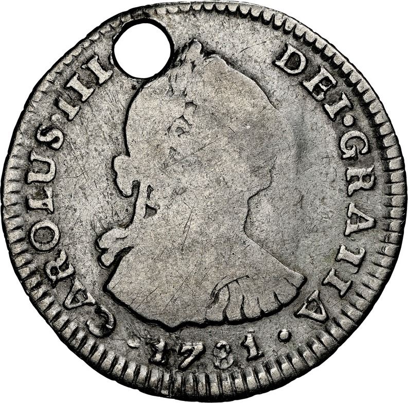 COLOMBIA, Bogotá, bust 1 real, Charles III, 1781 JJ, mintmark N•R, no • before JJ, rare, NGC VG details / holed, ex-Becerra. Restrepo-38.11a; KM-46.1; Cal-505. Non-toned and a bit crude, with weak bust and lightly laminating reverse, also with large but neat hole at top, a rare variety without dot between J's yet potentially a unique sub-variety (not mentioned in Restrepo) lacking the usual dot between the denomination and assayer. Pedigreed to the Becerra Collection (stated on label).
