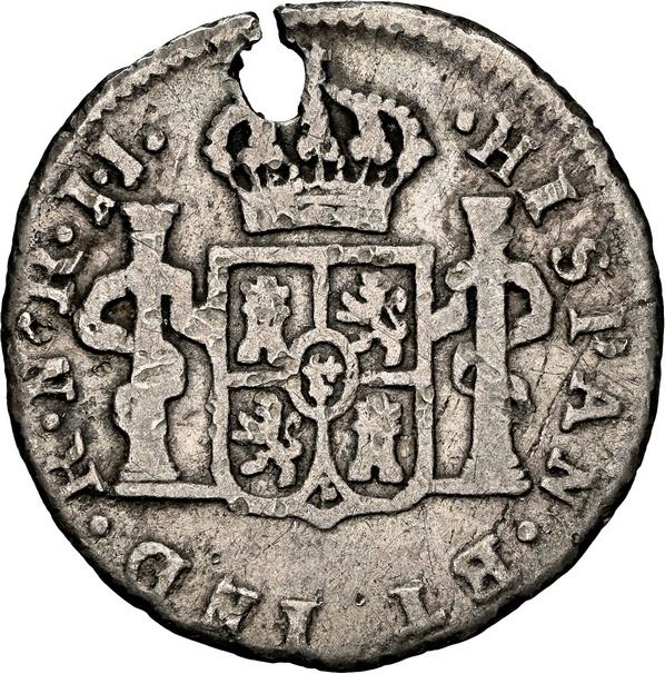 COLOMBIA, Bogotá, bust ½ real, Charles III, 1781 JJ, very rare, NGC G details / holed, ex-Becerra. Restrepo-32.11; Cal-274; KM-45.1. Very rare date as one of just four known. Stripped hole above weak bust yet with bold legends, a few surface marks on obverse, crude rims (as made), dark gray-toned surfaces. Pedigreed to the Becerra Collection (stated on label).