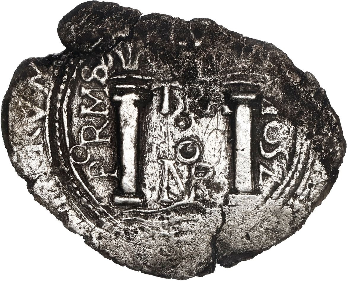 COLOMBIA, Bogotá, cob 4 reales, 1652 PoRMS, very rare, ex-Zbar. Restrepo-unl (cf M38.2); S-B7; Cal-unl (Type 288); KM-unl (10.1 for type). 7.05 grams. Choice full pillars with full assayer, date, and oNR mintmark, also full shield, with nicely contrasting toning all over, but about a third of the edge missing from corrosion and also a bit thin. By our records, this is the first instance we have seen of this date-assayer combination in 4 reales (unlisted in Calicó and KM), although it is well known in 8 reales. Pedigreed to the Jack Zbar Collection. Recovered from: Maravillas, sunk in 1656 off Grand Bahama Island