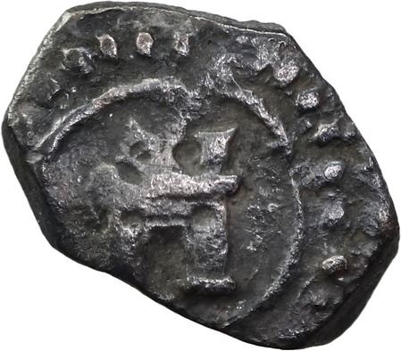 COLOMBIA, Bogotá, cob ¼ real, Philip IV, no assayer (1649-65), narrow castle with no windows / slender lion, ring-inside-dots borders. Restrepo-M14.3; KM-B7; Cal-531. 0.81 gram. Oblong flan with full lion and castle (the latter off-center), clear ring-inside-dots borders on both sides, the combination of border and lion/castle styles indicative of late Philip IV, darkly toned XF with minor surface porosity.