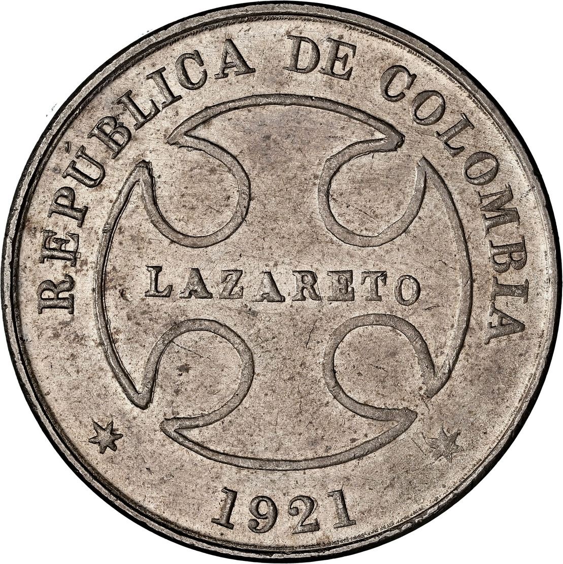 COLOMBIA, Bogotá, copper-nickel 50 centavos, 1921-RH, Lazareto, NGC MS 63, finest and only example in NGC census, Restrepo Plate (stated on label), Yepes Plate. Restrepo-417; KM-L13. Choice luster and faint rainbow toning, unique grade, the largest denomination of the finest denomination set in existence (see next four lots). Plate Coin on page 238 of Restrepo's Coins of Colombia (4th edition, 2012) and on page 126 of Lepra y Coleccionismo en Colombia (2011), by Andrés Yepes Pérez.