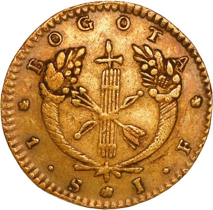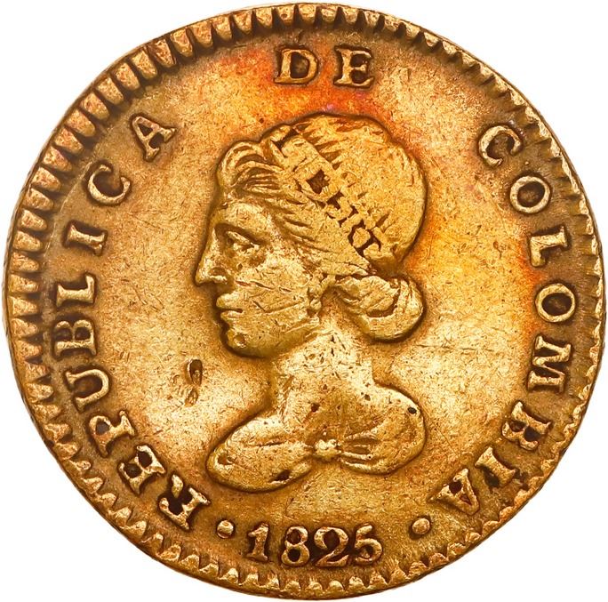COLOMBIA, Bogotá, gold 1 escudo, 1825 JF, ex-JEAS. Restrepo-161.3; KM-81.1. 3.26 grams. VF, scuff and surface mark on obverse, dull luster. Pedigreed to the JEAS Collection.