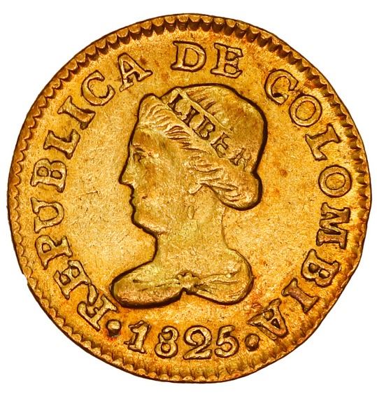 COLOMBIA, Bogotá, gold 1 peso, 1825 JF, 1/1 in date, ex-JEAS. Restrepo-160.1 var; Sed-1; KM-84; Fr-73. 1.74 grams. Lustrous AU with light toning at rims, bold strike, clearly re-punched 1 in date (a variety not noted by Restrepo and presumably rare). Pedigreed to the JEAS Collection.