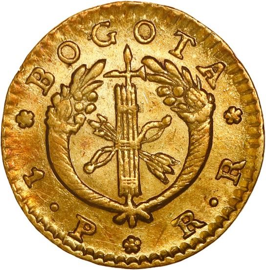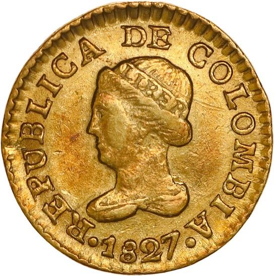 COLOMBIA, Bogotá, gold 1 peso, 1827 RR, medal alignment, ex-JEAS. Restrepo-160.7i; Sed-1; Fr-73; KM-84. 1.66 grams. Bold AU+ with spots of reddish toning over muted luster, a few light marks and faint hairlines. Pedigreed to the JEAS Collection.