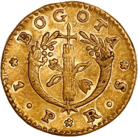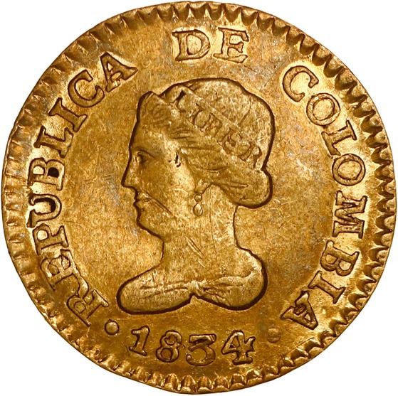 COLOMBIA, Bogotá, gold 1 peso, 1834 RS, ex-JEAS. Restrepo-160.12; Sed-1; Fr-73; KM-84. 1.66 grams. AU with bright luster around details, light marks, slightly bent. Pedigreed to the JEAS Collection.