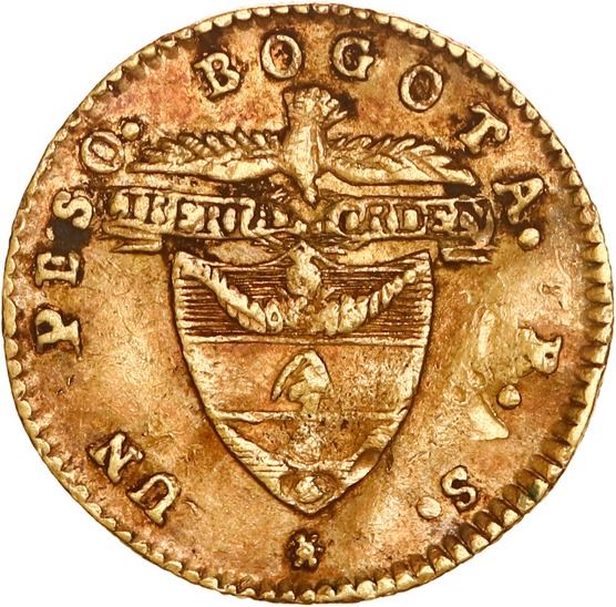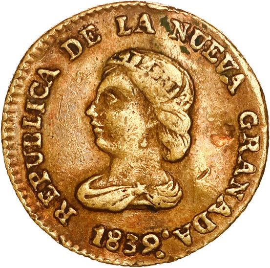 COLOMBIA, Bogotá, gold 1 peso, 1839 RS, rare, ex-JEAS. Restrepo-200.5; KM-93; Fr-77. 1.72 grams. VF, bent with some surface damage, dull luster. Pedigreed to the JEAS Collection.