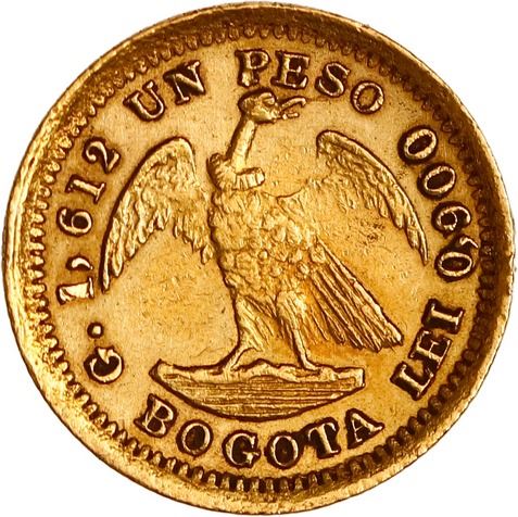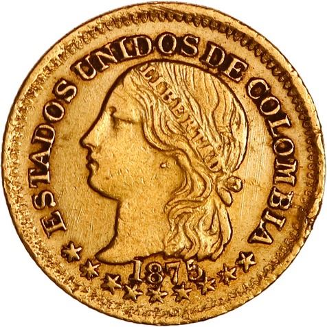COLOMBIA, Bogotá, gold 1 peso, 1875, ex-JEAS. Restrepo-322.5; Sed-32; Fr-109; KM-157.2. 1.51 grams. AU with matte fields, dark sediment around details, slightly crude rims as usual. Pedigreed to the JEAS Collection.