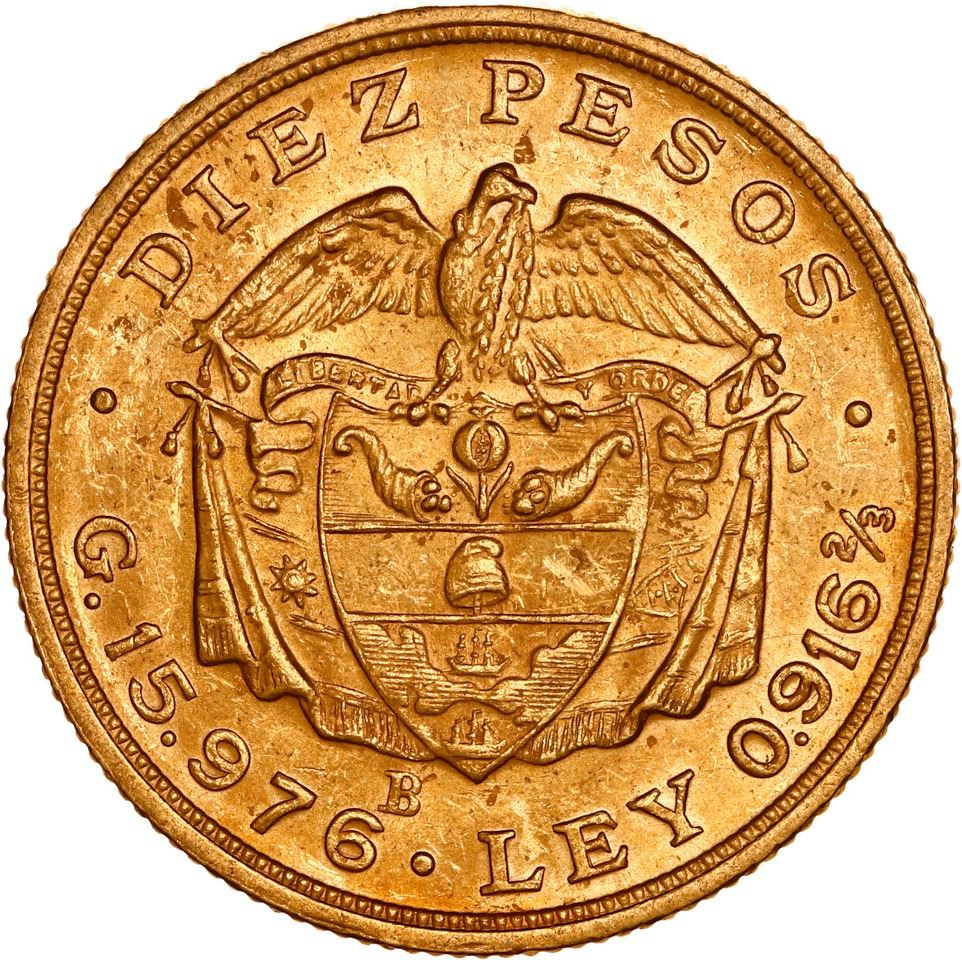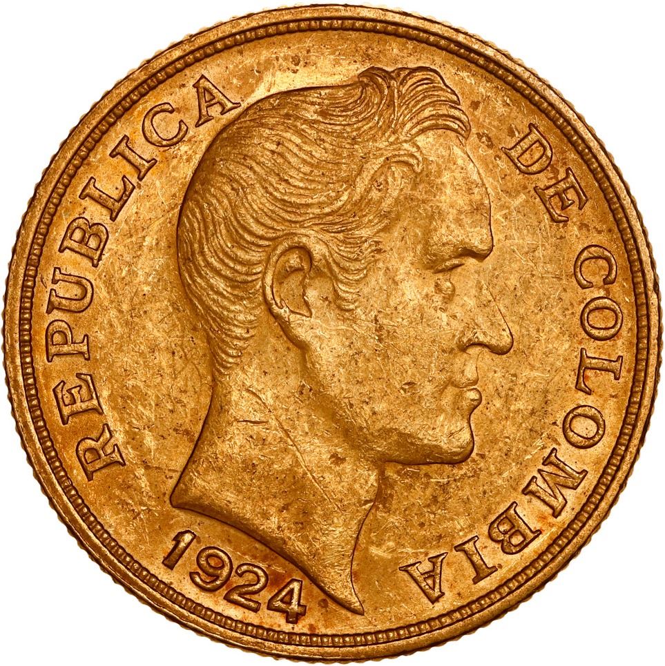 COLOMBIA, Bogotá, gold 10 pesos, 1924, mintmark B to left, ex-JEAS.