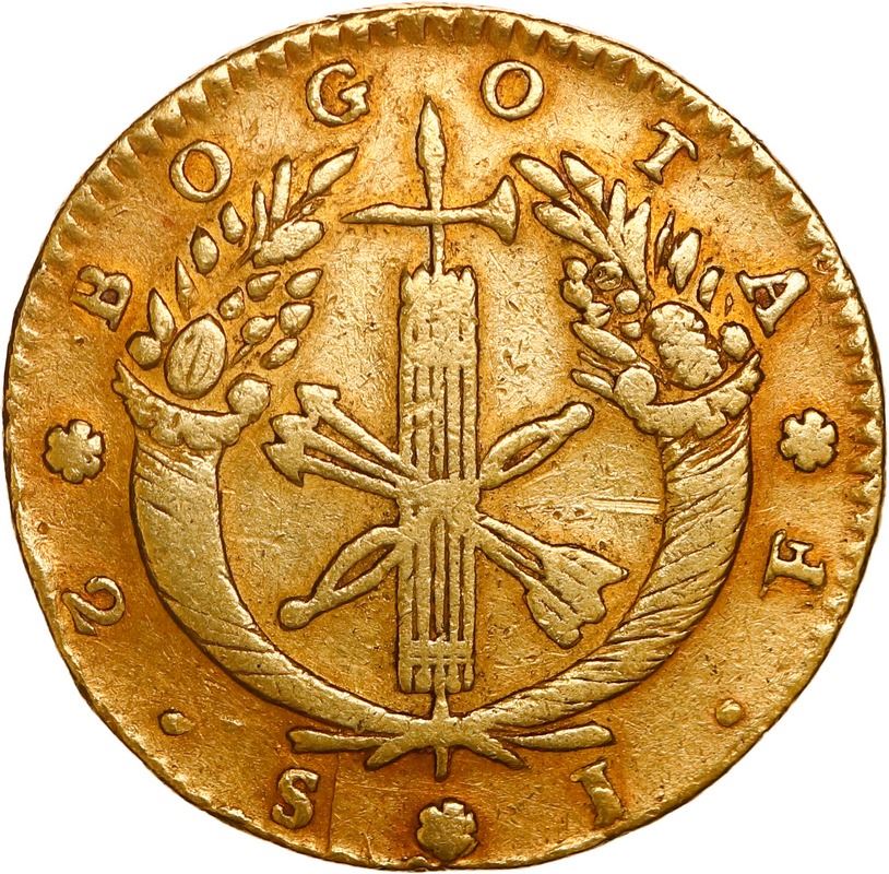 COLOMBIA, Bogotá, gold 2 escudos, 1825 JF, ex-JEAS. Restrepo-163.5; KM-83. 6.69 grams. About VF, lightly cleaned, red-gold toning around the edges. Pedigreed to the JEAS Collection.