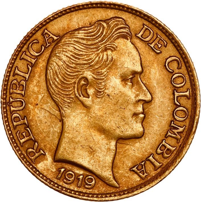 COLOMBIA, Bogotá, gold 2½ pesos, 1919, no mintmark, ex-JEAS. Restrepo-451.1; Sed-49; Fr-114; KM-200. 4.17 grams. AU with weak condor, matte fields, interesting die-clash visible on obverse, AGW 0.1177 oz. Pedigreed to the JEAS Collection.