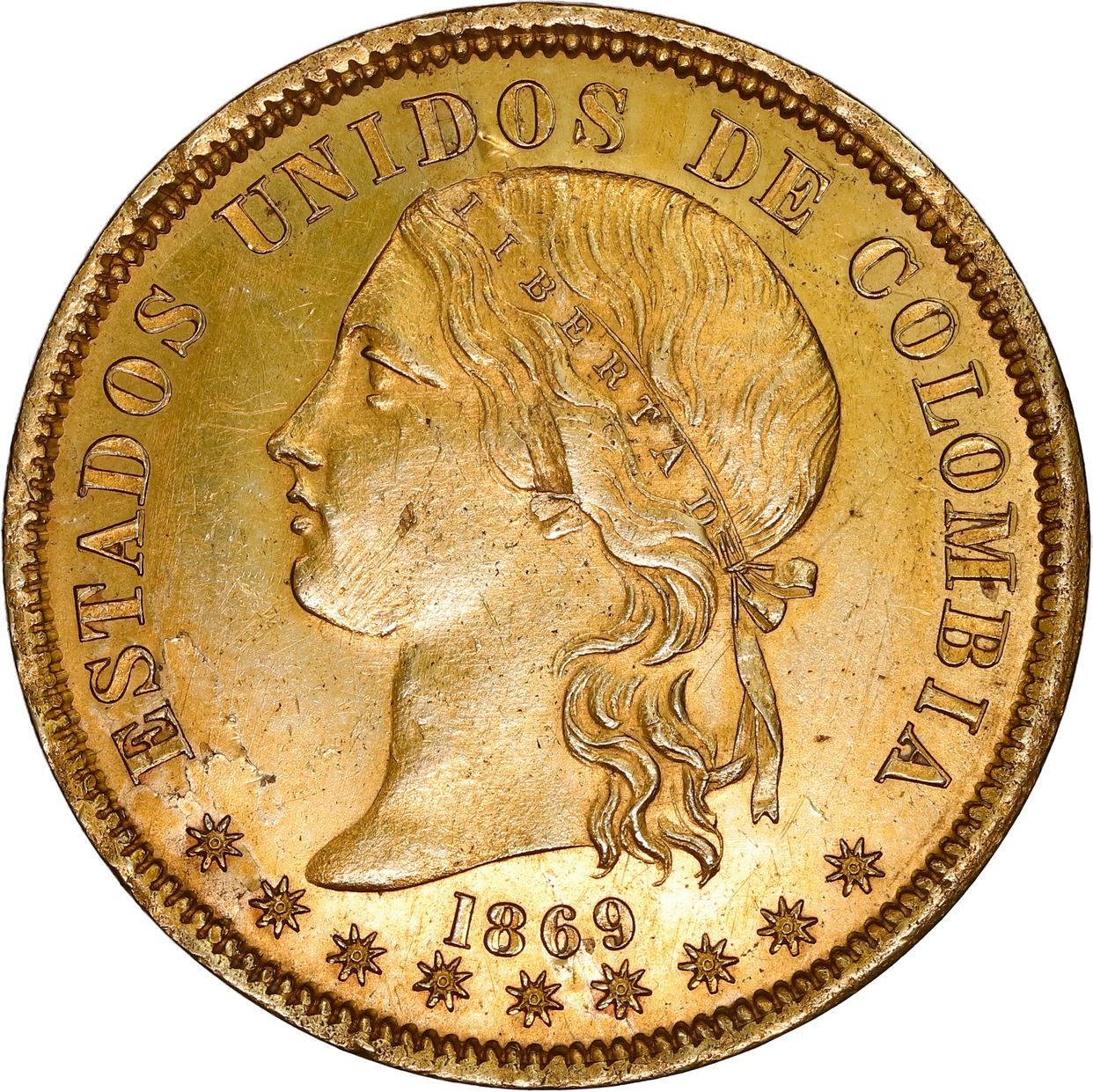 COLOMBIA, Bogotá, gold 20 pesos, 1869, NGC MS 61, finest and only example in NGC census, ex-JEAS. Restrepo-336.5; Sed-43; KM-142.1; Fr-99. Choice strike with unblemished surfaces save for light hairlines, lustrous all over, scarce and popular type (this date rated RRR in Sedwick but not noted as rare in Restrepo). Pedigreed to the JEAS Collection.