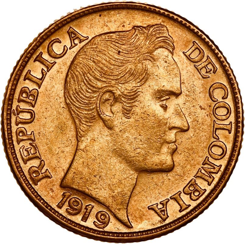 COLOMBIA, Bogotá, gold 5 pesos, 1919, mintmark B to right, ex-JEAS. Restrepo-454.6; KM-201.1. 7.94 grams. AU+, lustrous surfaces with red-gold hues, hairlines across the bust, scarce variety (AGW 0.2355 oz). Pedigreed to the JEAS Collection.