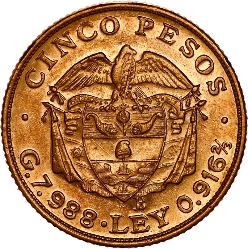 COLOMBIA, Bogotá, gold 5 pesos, 1919, mintmark B to right, ex-JEAS.