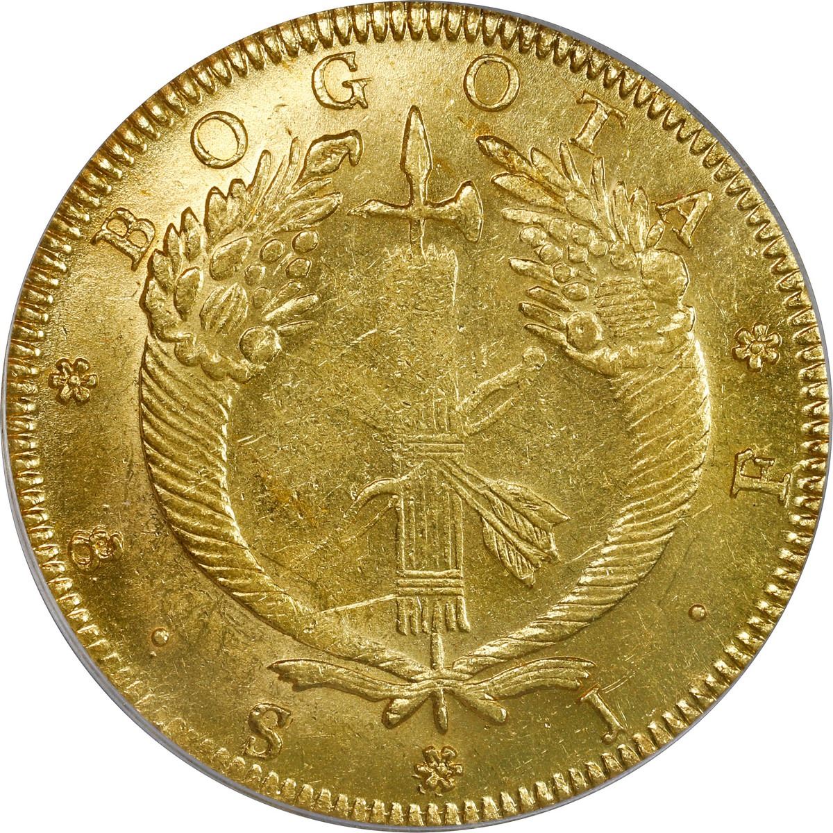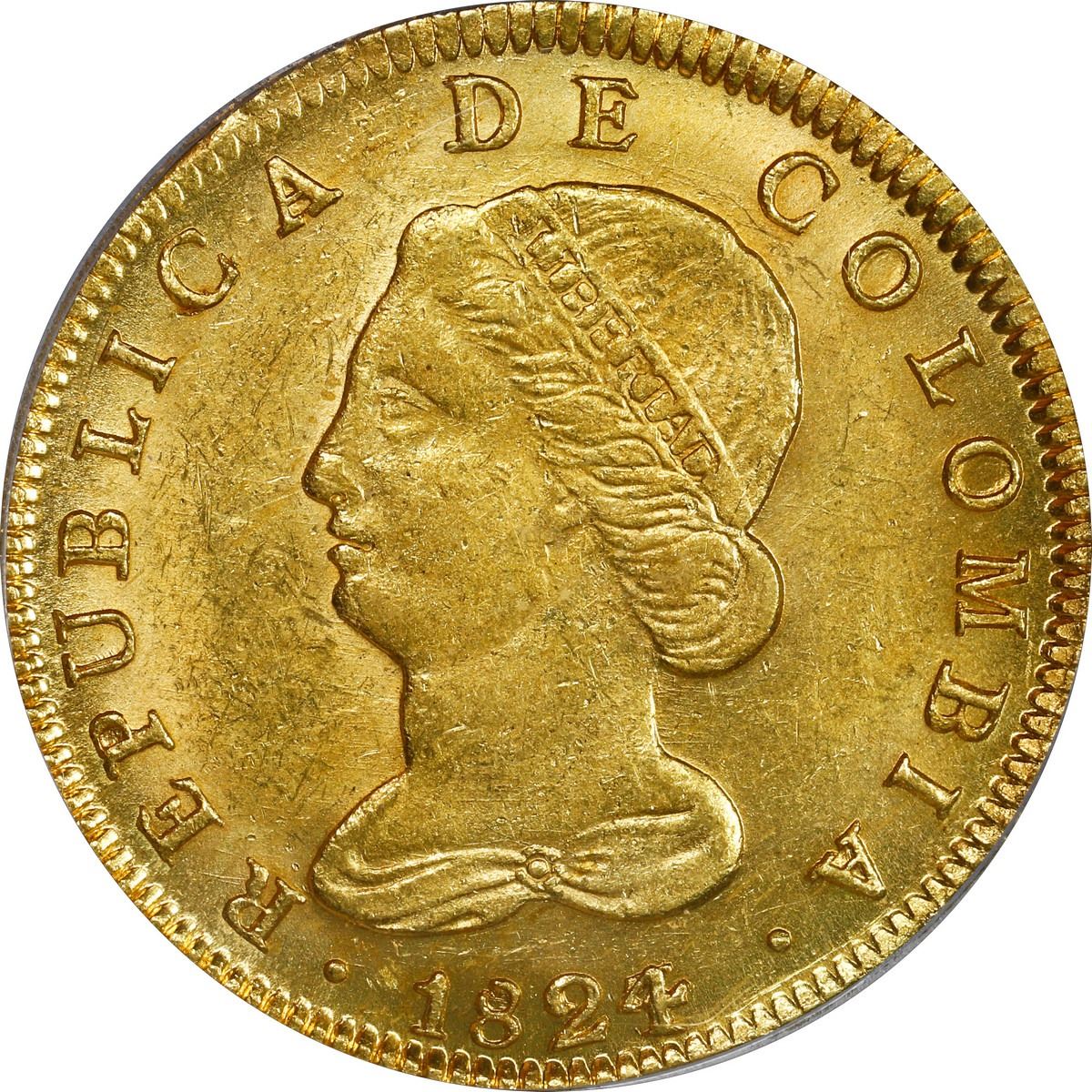 COLOMBIA, Bogotá, gold 8 escudos, 1824/3 JF, PCGS MS61, finest known in PCGS census.