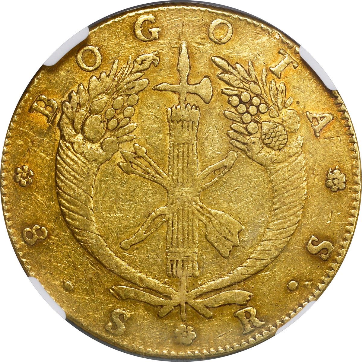 COLOMBIA, Bogotá, gold 8 escudos, 1834 RS, NGC XF details / cleaned.