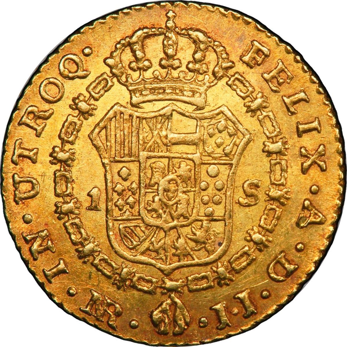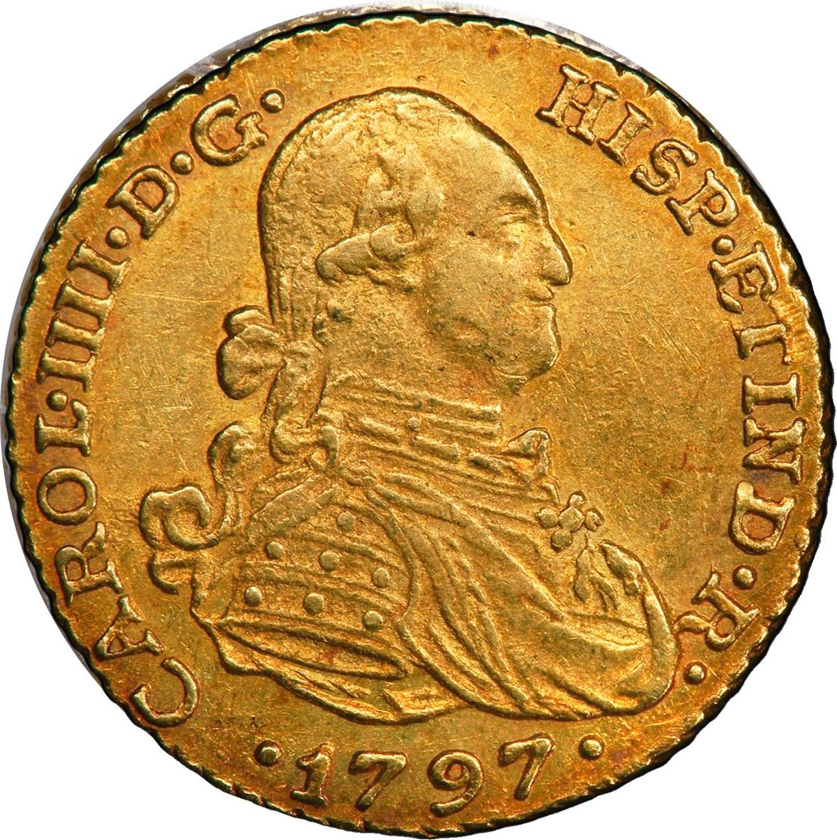 COLOMBIA, Bogotá, gold bust 1 escudo, Charles IV, 1797 JJ, PCGS AU58, "top pop."