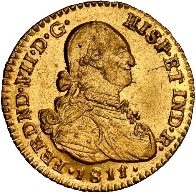 COLOMBIA, Bogotá, gold bust 1 escudo, Ferdinand VII (bust of Charles IV), 1811 JF, NGC MS 64, finest