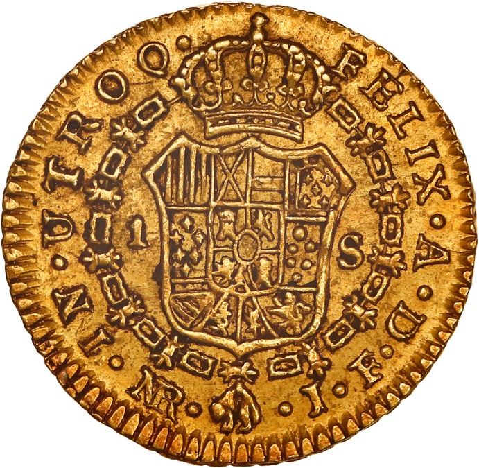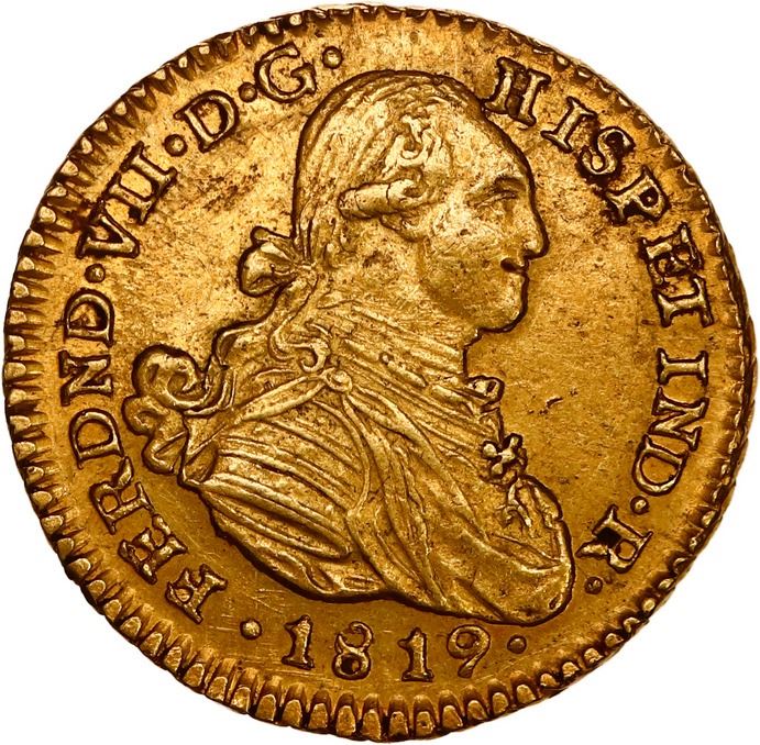 COLOMBIA, Bogotá, gold bust 1 escudo, Ferdinand VII (bust of Charles IV), 1819 J•F, ex-JEAS. Restrepo-122.25; Cal-1558; Fr-65; KM-64.1. 3.40 grams. Bold AU+ in rich gold color with muted luster, satin fields, light encrustation around some details. Pedigreed to the JEAS Collection.