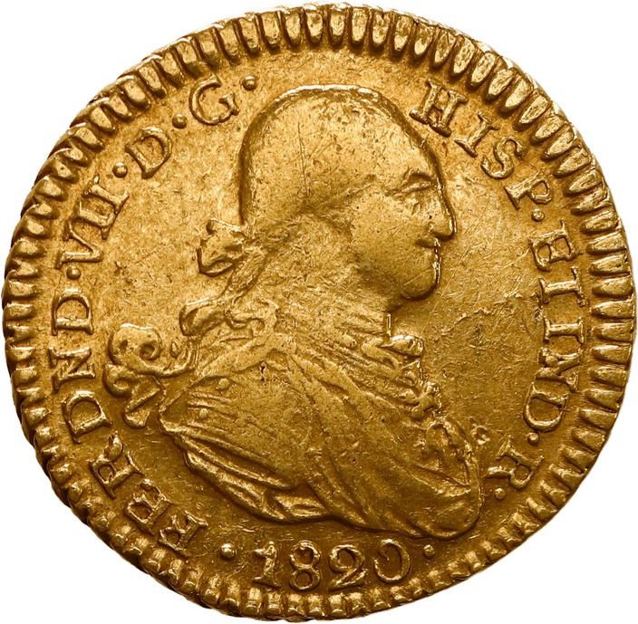 COLOMBIA, Bogotá, gold bust 1 escudo, Ferdinand VII (bust of Charles IV), 1820 JF, ex-JEAS.